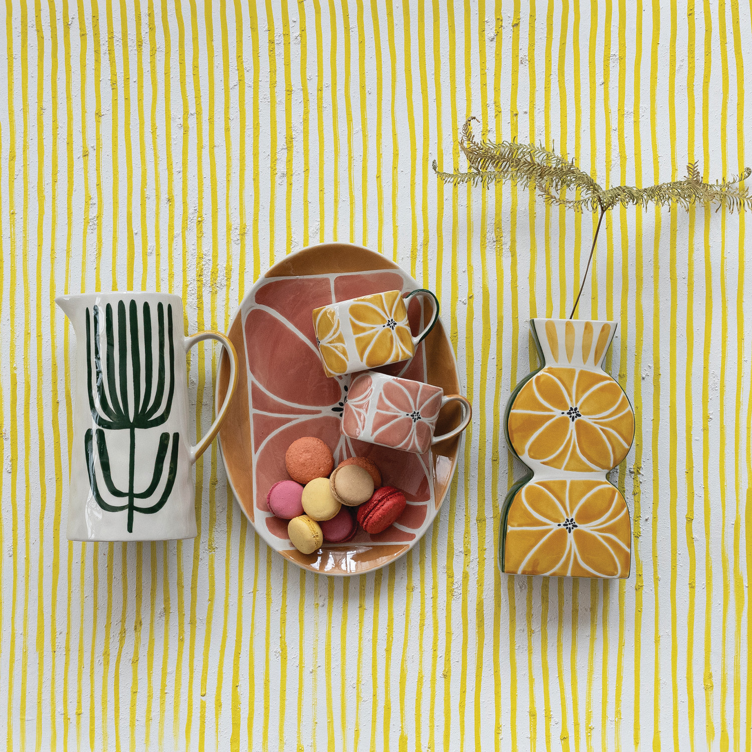 Catalog Name: 5"L x 2"W x 10-1/4"H Stoneware Vase w/ Wax Relief Design, Yellow, Green & White