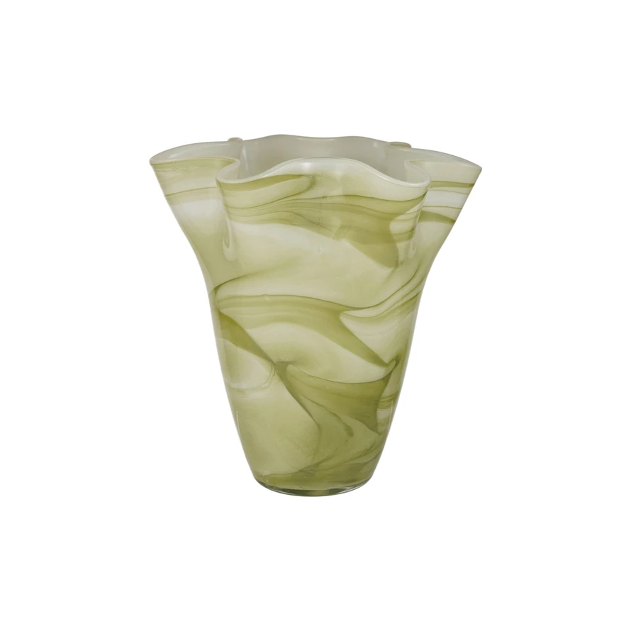 Hand-Blown Glass Ruffled Vase with Swirled Design, Opaque Green & White (Each One Will Vary)