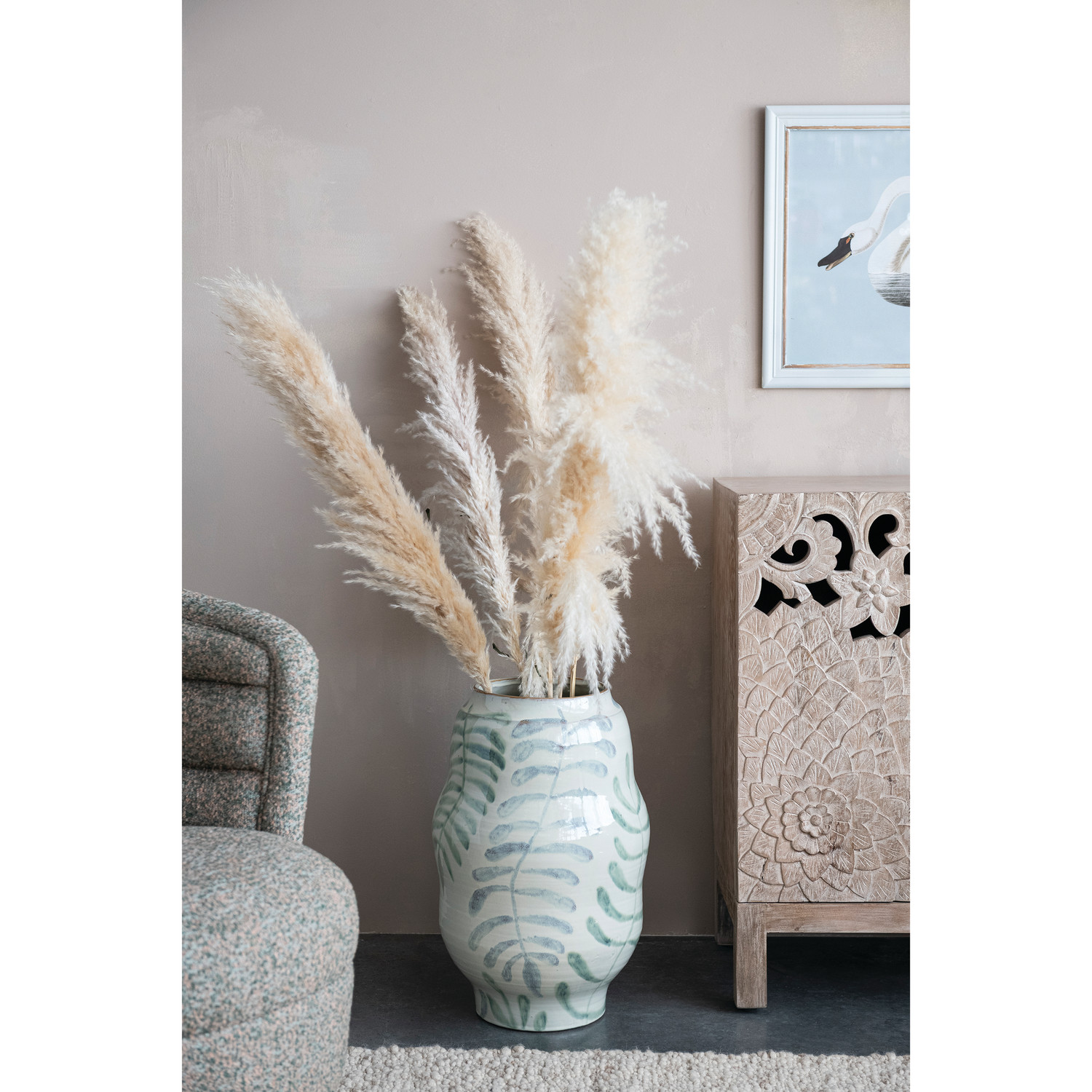 Catalog Name: 14-1/2" Round x 22"H Hand-Painted Stoneware Organic Shaped Vase w/ Botanicals, Reactive Glaze, White, Green & Blue, Truck Ship (Each One Will Vary)