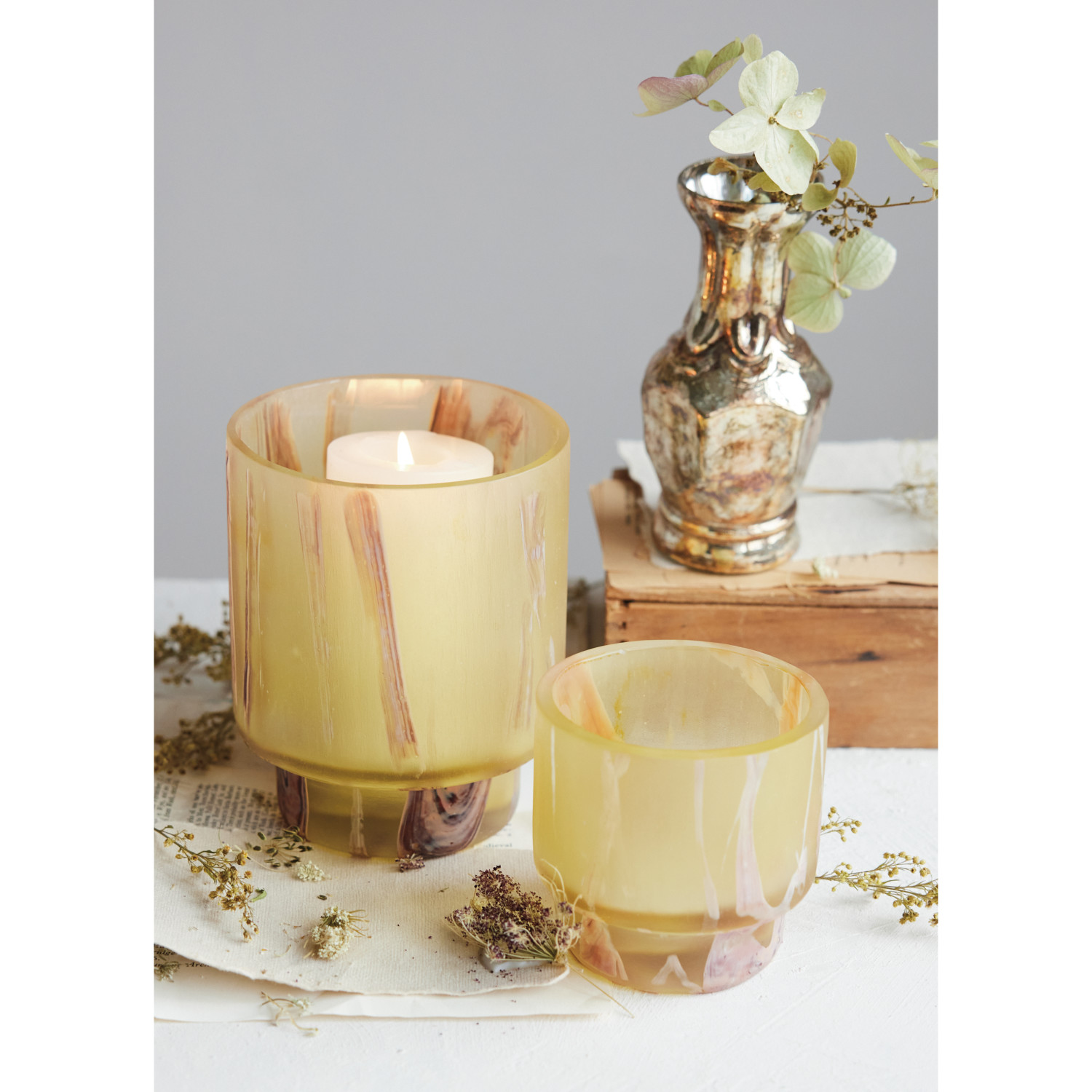 Catalog Name: 4" Round x 5"H Art Glass Footed Tealight/Votive Holder, Marbled Yellow, Brown & Orange Color (Each One Will Vary)