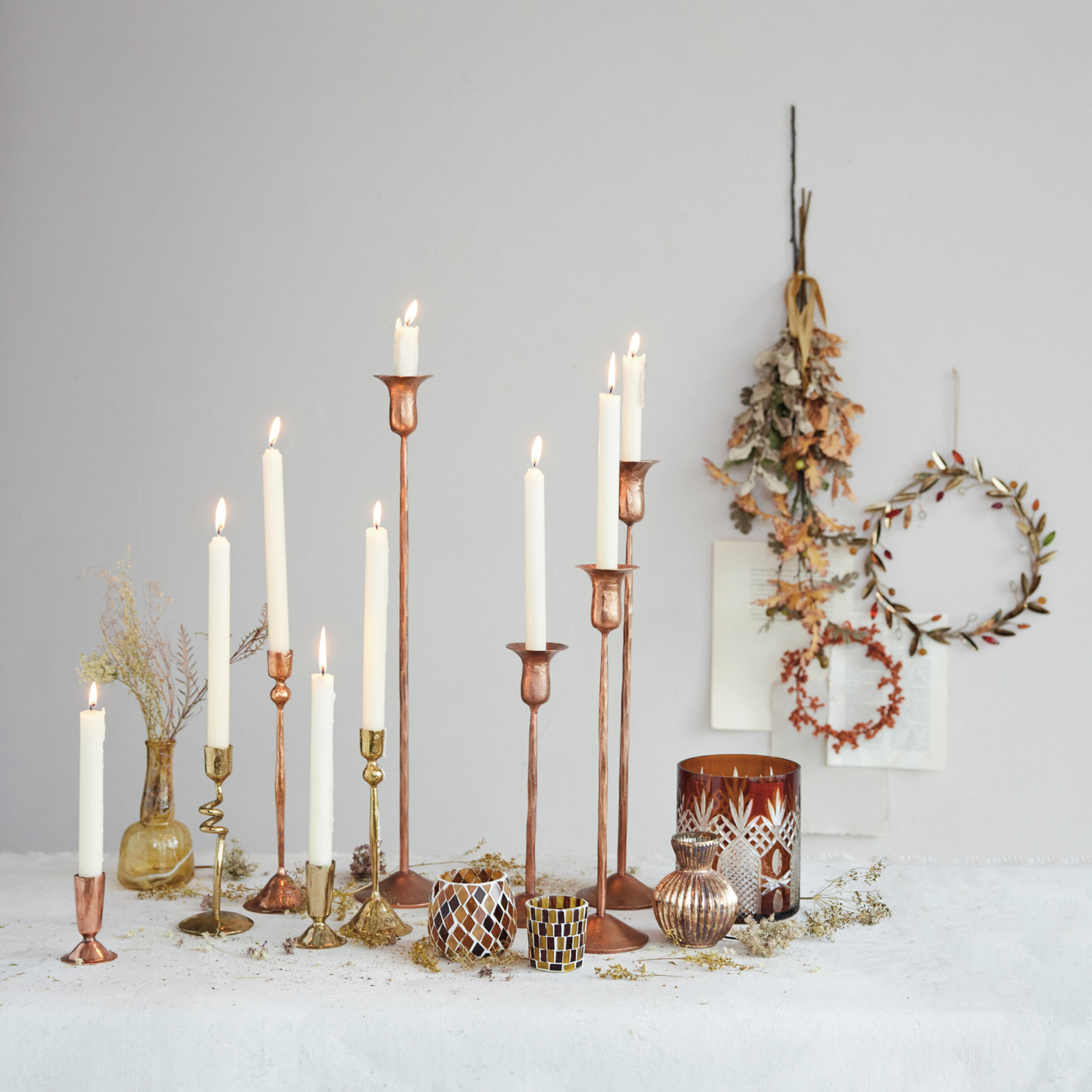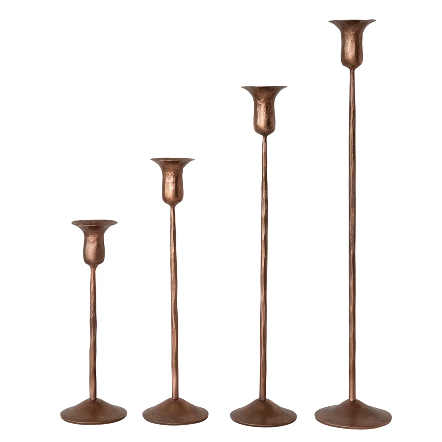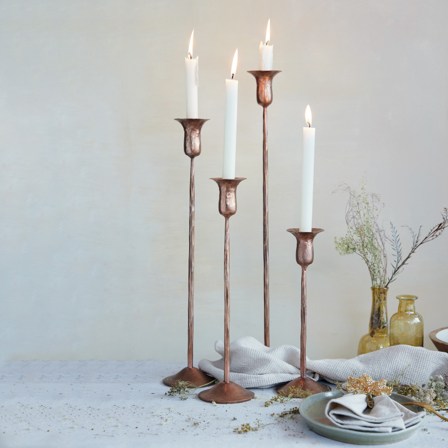 Catalog Name: 11-1/4"H - 22-1/2"H Hand-Forged Iron Taper Holders, Copper Finish, Set of 4
