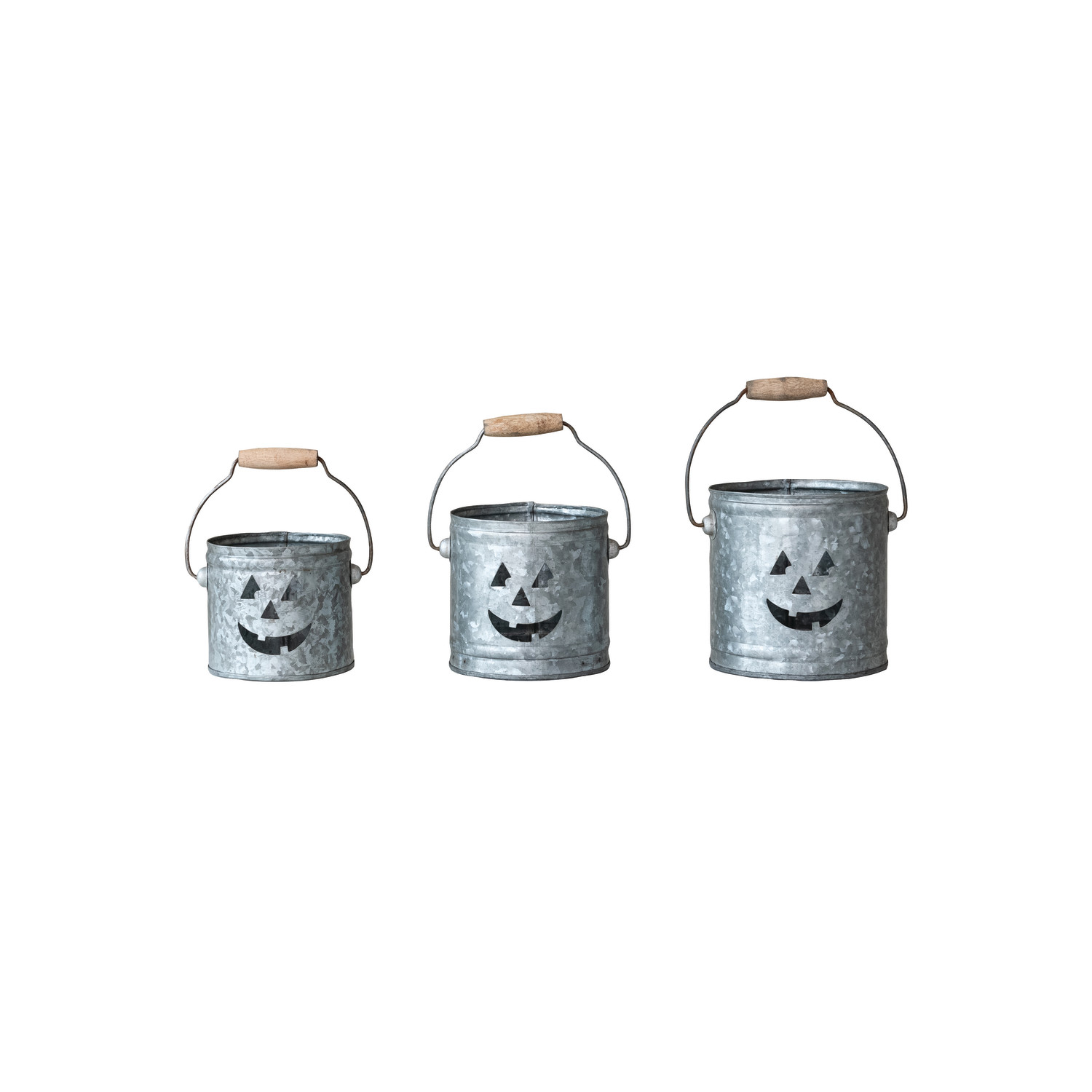 Catalog Name: 7"L x 5-3/4"W x 5-3/4"H, 6-1/2"L x 5-1/4"W x 5"H & 5-3/4"L x 4-1/2"W x 4-1/4"H Galvanized Metal Buckets/Lanterns w/ Cut-Out Jack-O-Lantern Faces, Set of 3