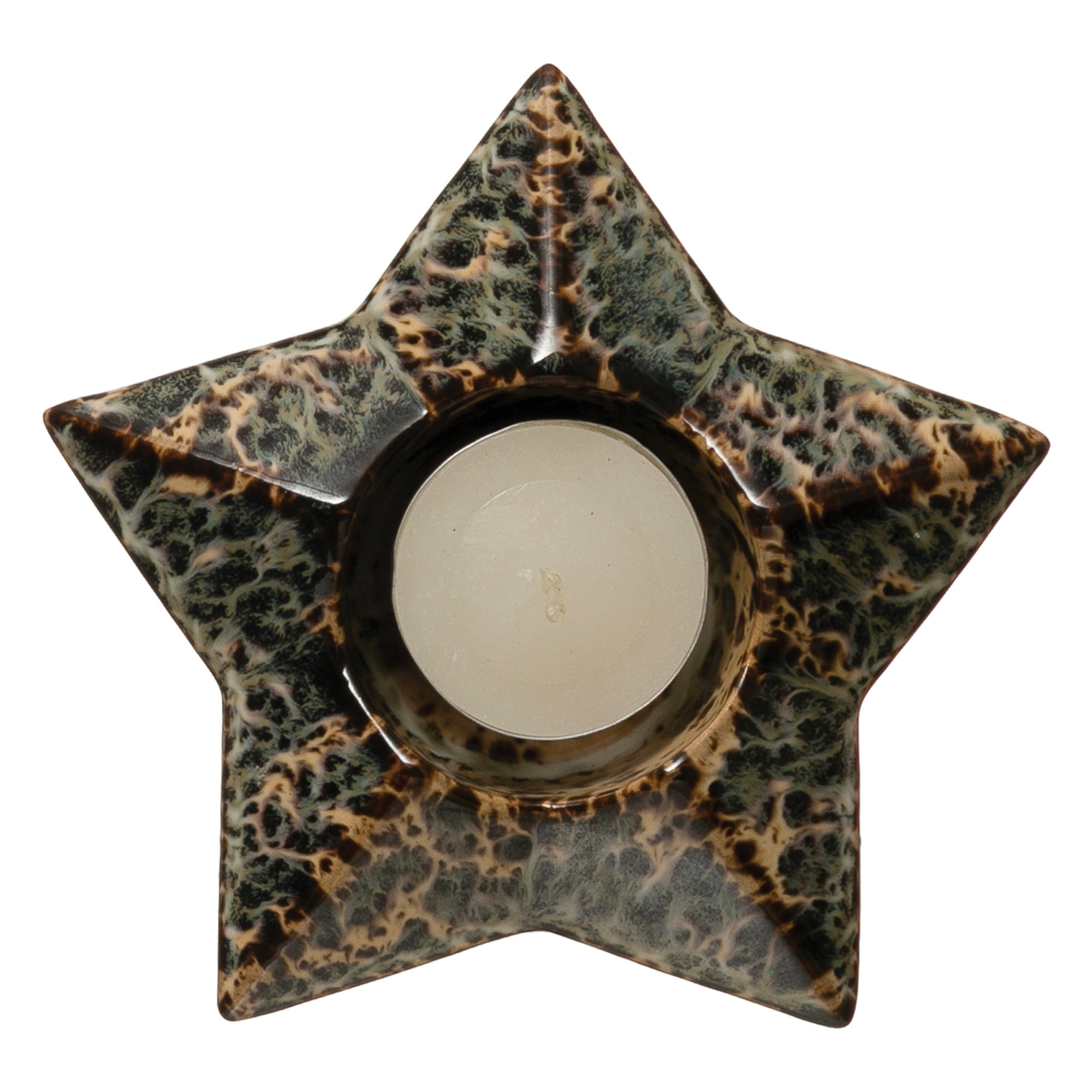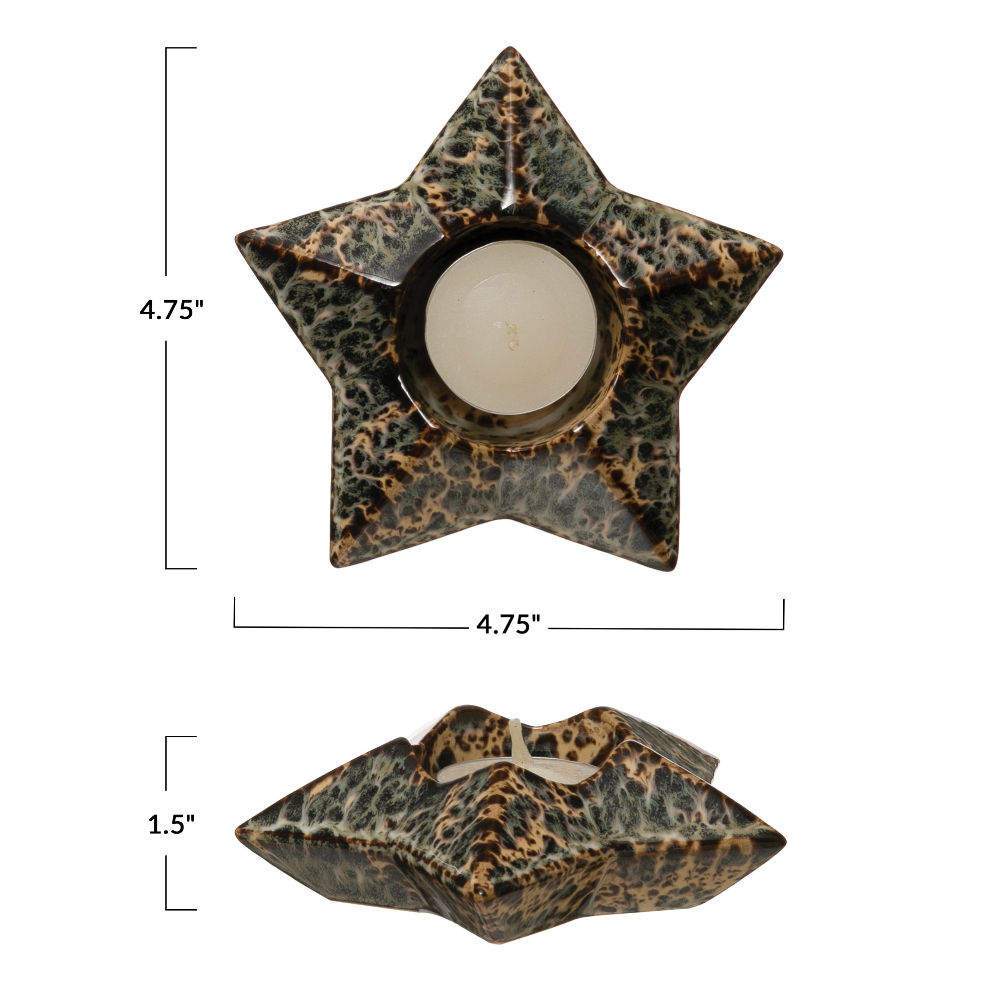 Catalog Name: 4-3/4"L x 4-3/4"W x 1-1/2"H Stoneware Star Tealight Holder, Reactive Glaze, Green Speckled (Each One Will Vary)