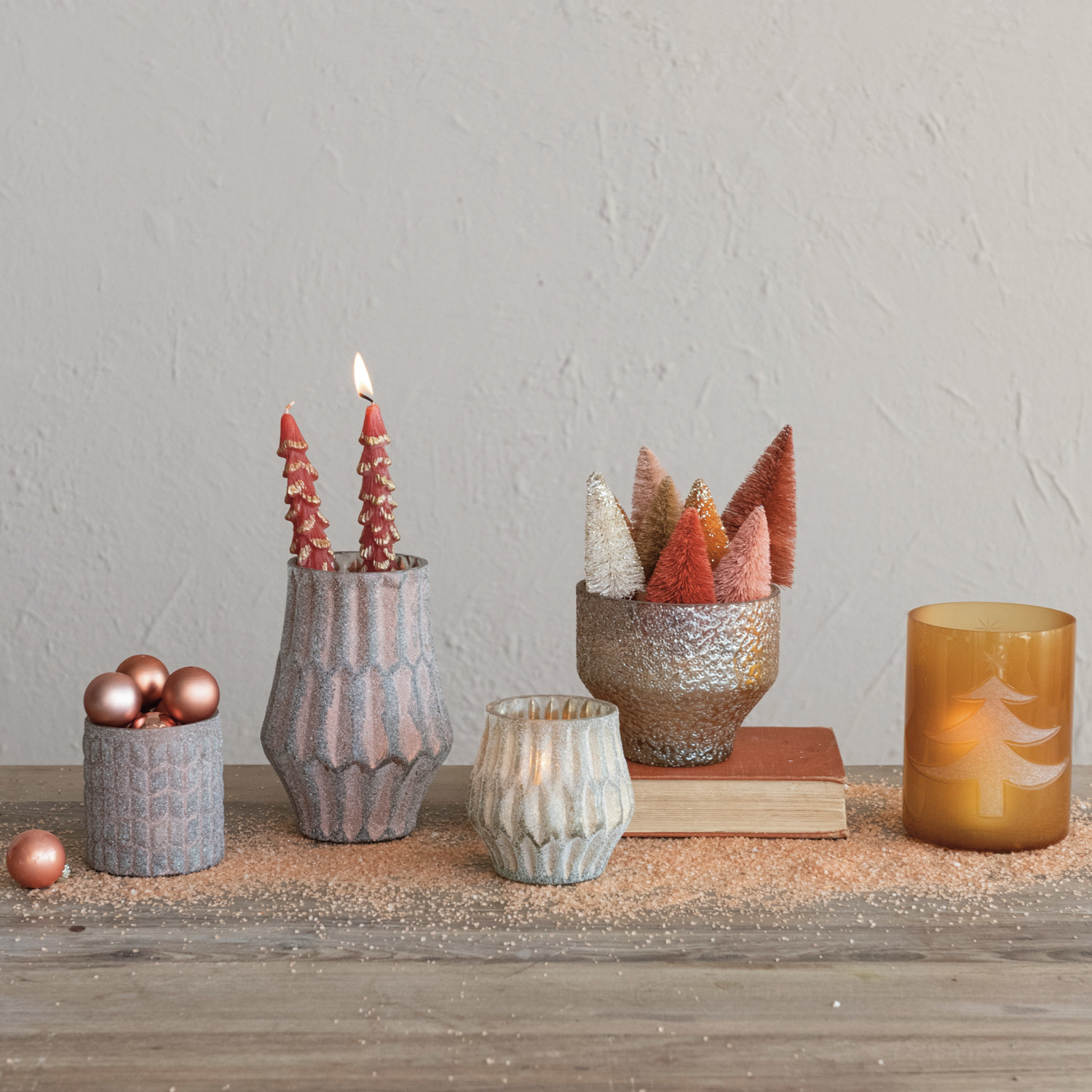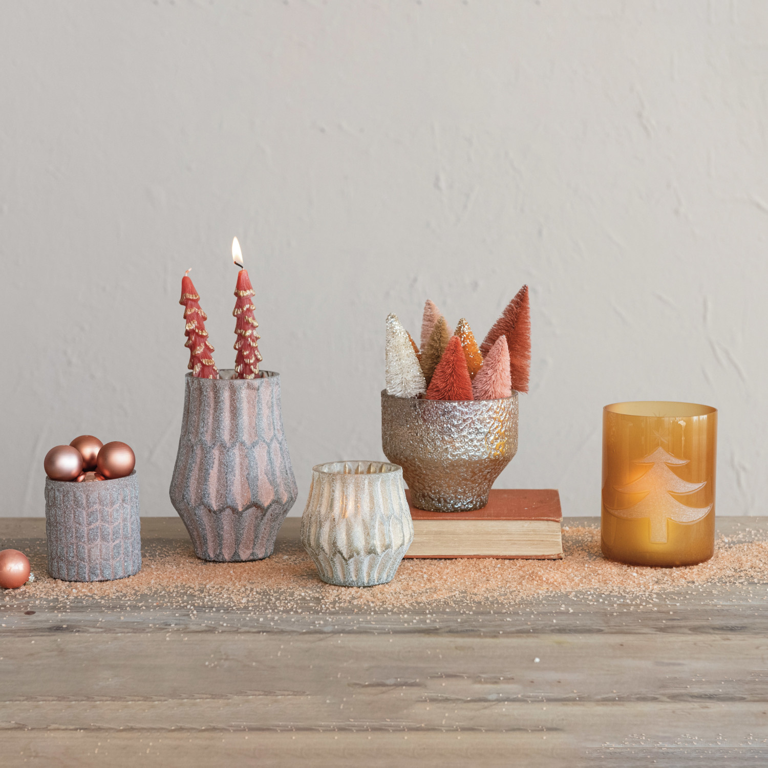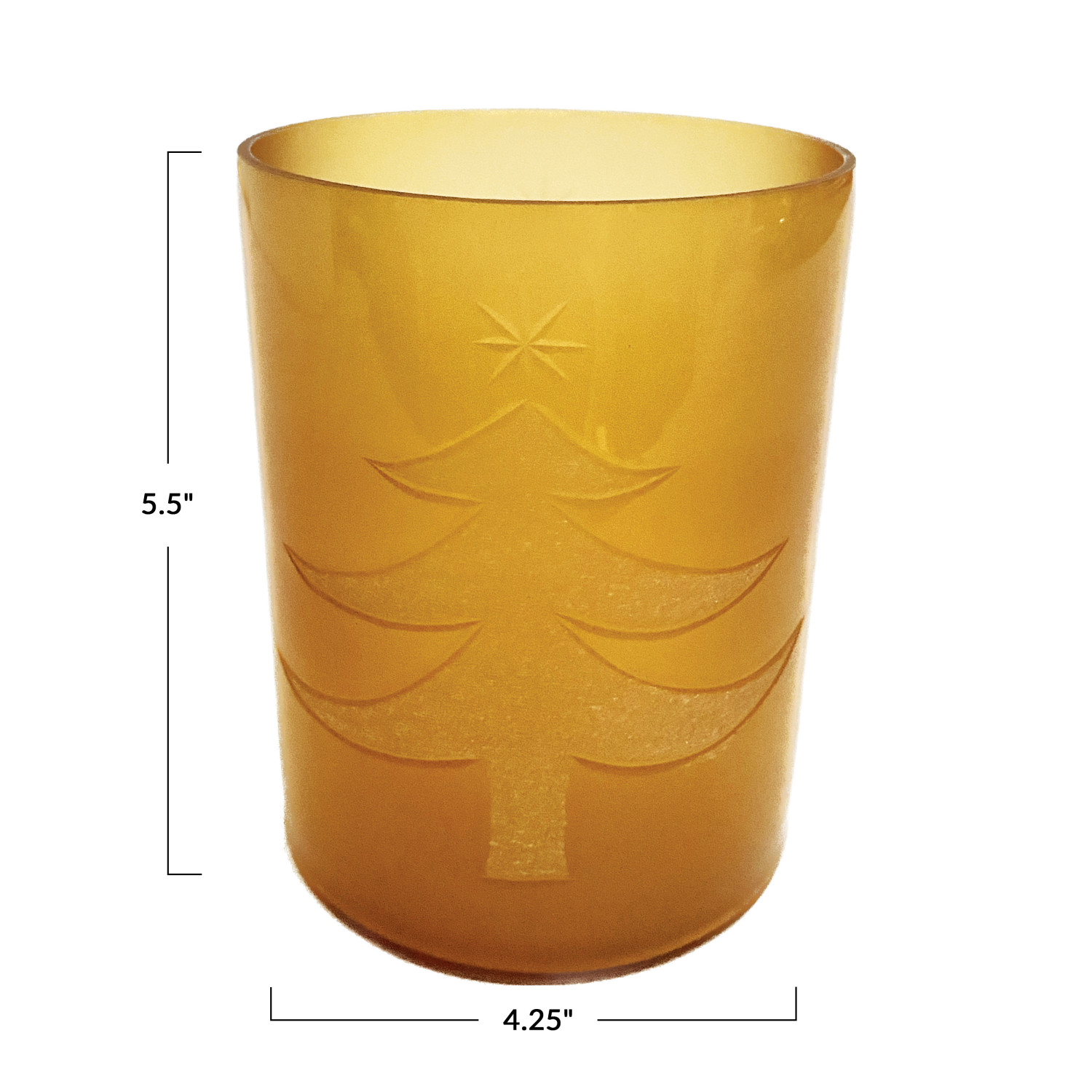 Recycled Glass Votive Holder w/ Etched Christmas Tree, Apricot Color