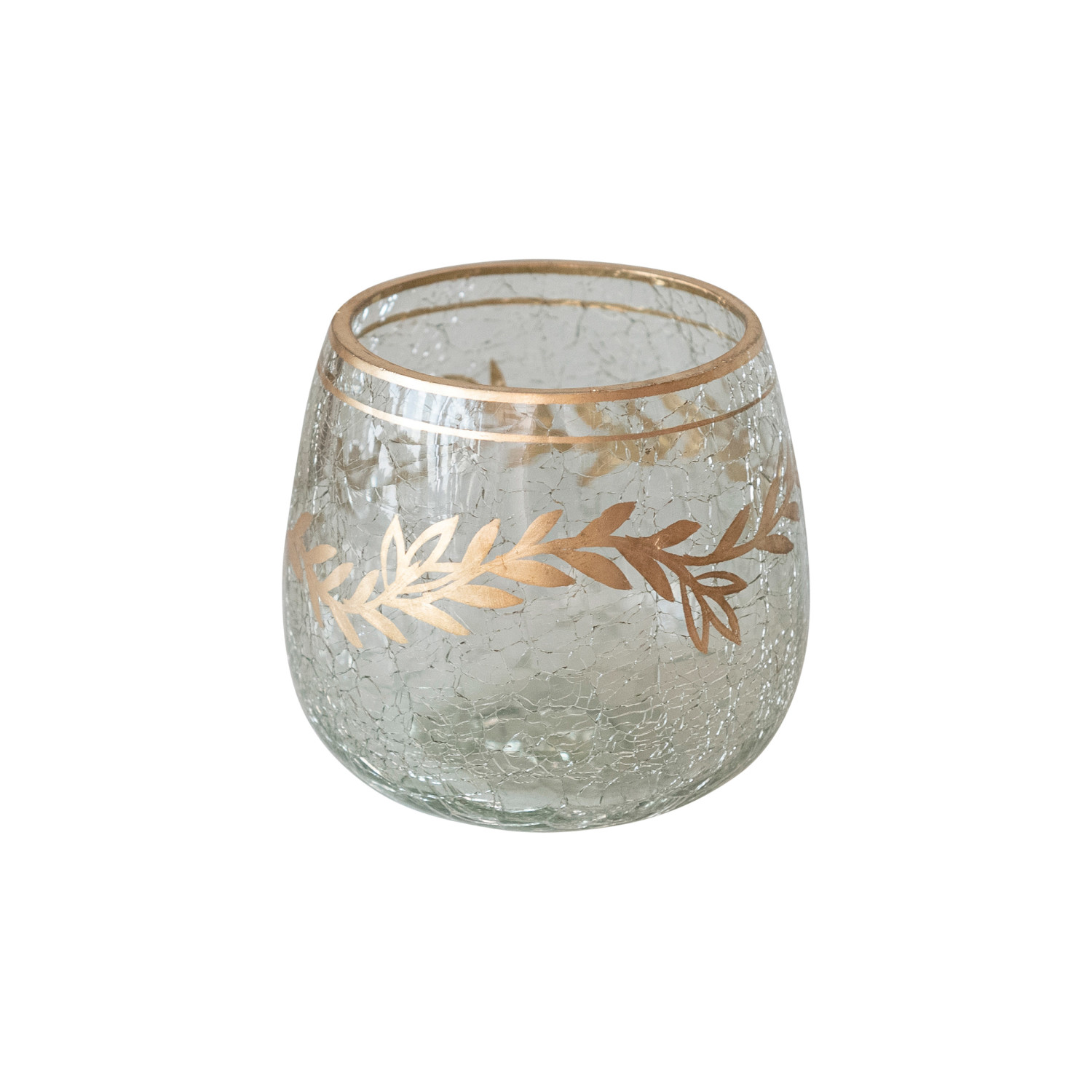 Catalog Name: 3" Round x 3"H Recycled Glass Tealight/Votive Holder w/ Gold Finish Design, Crackle Finish (Each One Will Vary)