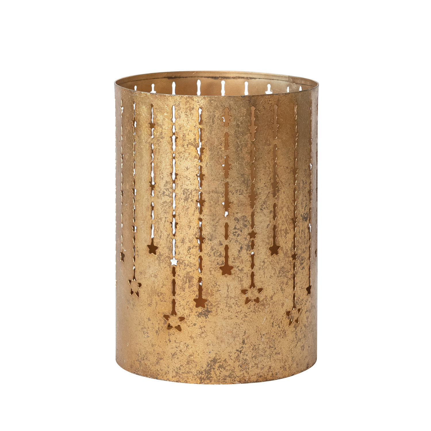 Catalog Name: 5" Round x 7"H Textured Metal Tealight/Votive Holder w/ Cut-Outs, Antique Gold Finish