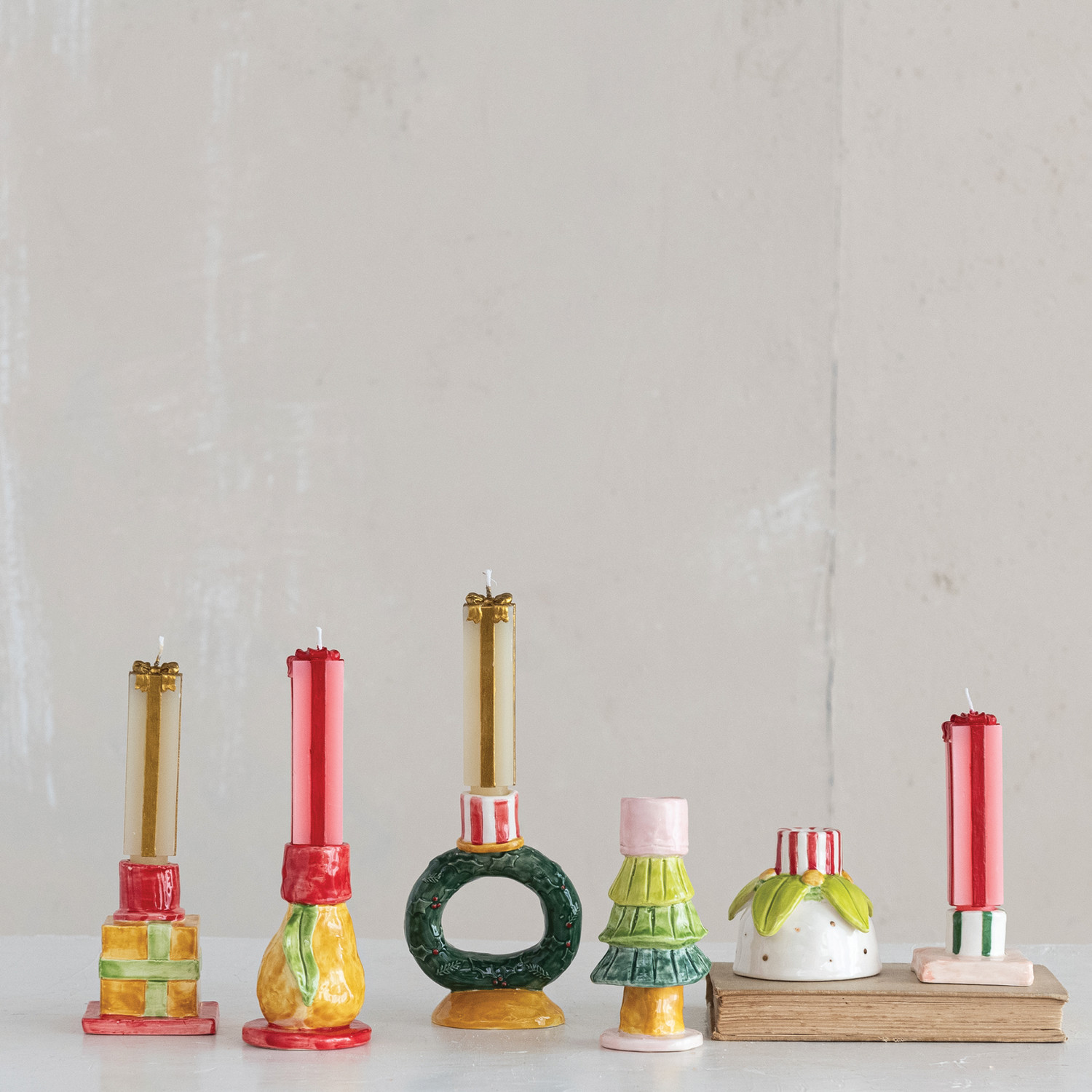 Catalog Name: 2-1/2" Round x 5-1/4"H Hand-Painted Stoneware Tree Shaped Taper Holder, Pink, Green & Yellow ©