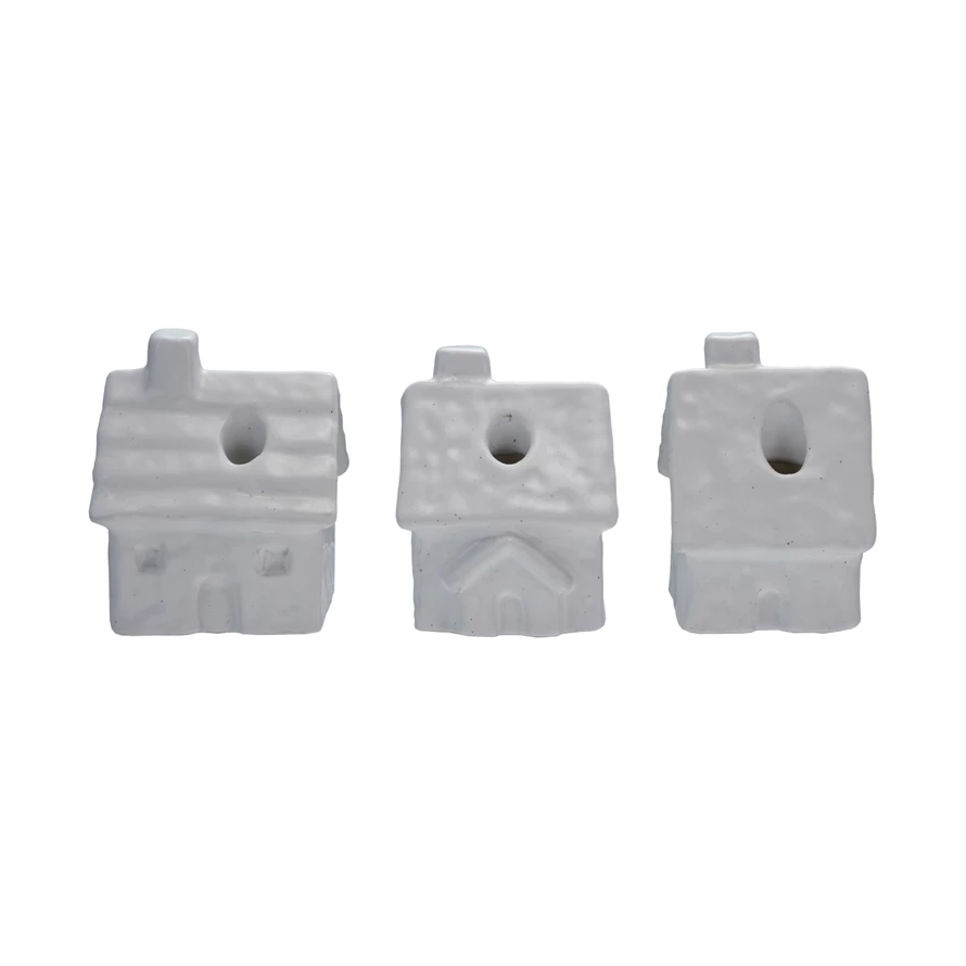 Catalog Name: 2-1/2" Square x 3"H Stoneware House Shaped Taper Holder, Reactive Glaze, White, 3 Styles (Holds 1/2" Taper) (Each One Will Vary)