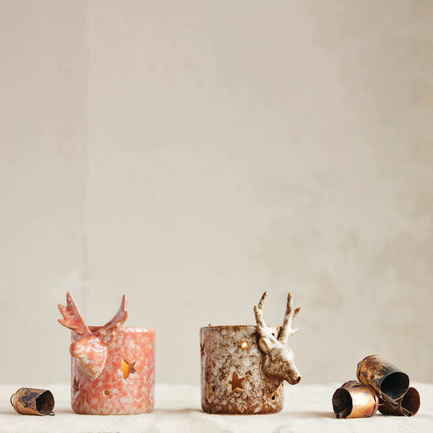 Catalog Name: 4-3/4"L x 3"W x 4-1/4"H Stoneware Tealight/Votive Holder w/ 3D Moose/Deer Head & Star Cut-Outs, Reactive Glaze, 2 Styles (Each One Will Vary)