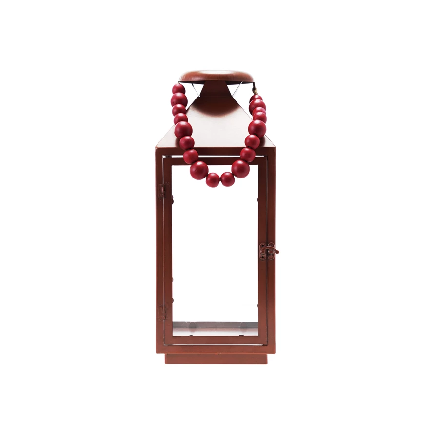 Metal & Glass Lantern with Wood Bead Handle, Black & Red