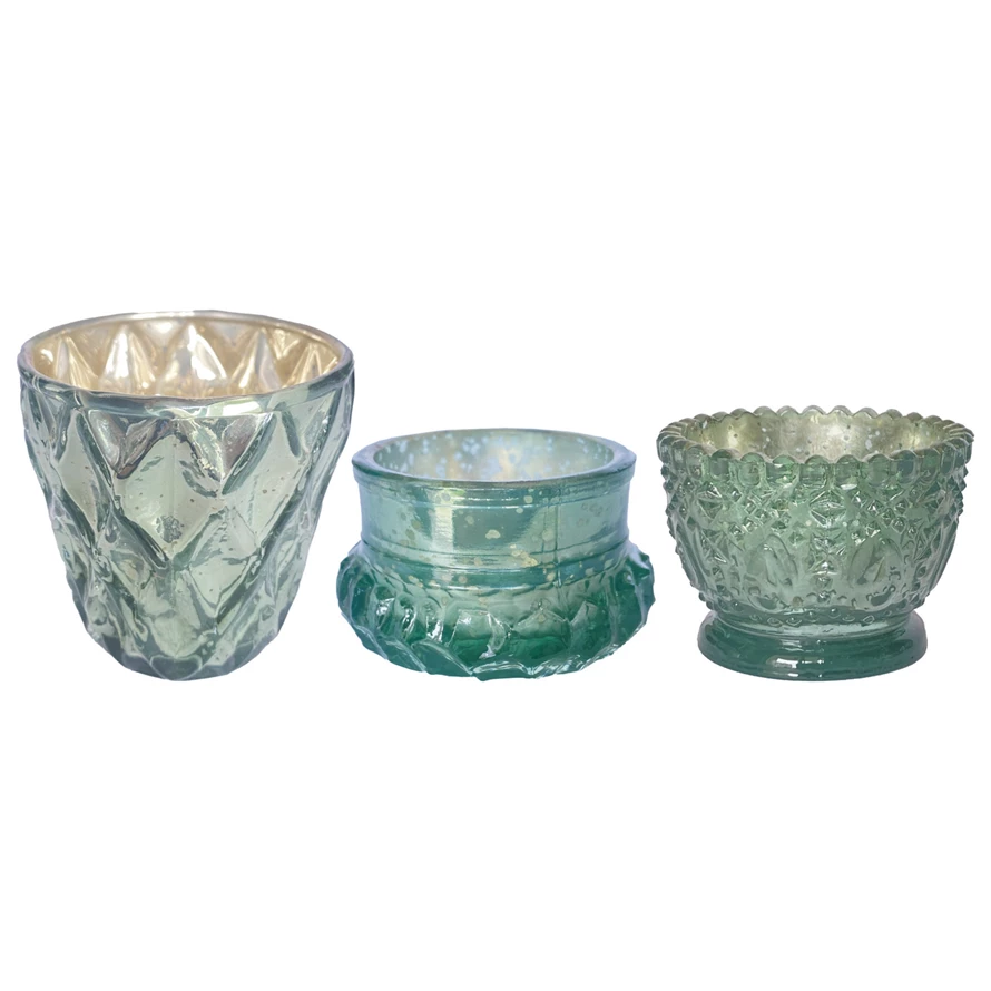 Catalog Name: 1-1/2"H - 2-3/4"H Embossed Mercury Glass Tealight/Votive Holder, Mint Color, 3 Styles