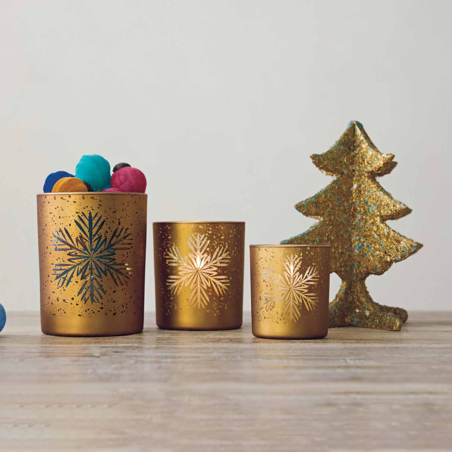 Mercury Glass Tealight/Votive Holder with Laser Etched Snowflake, Gold Finish