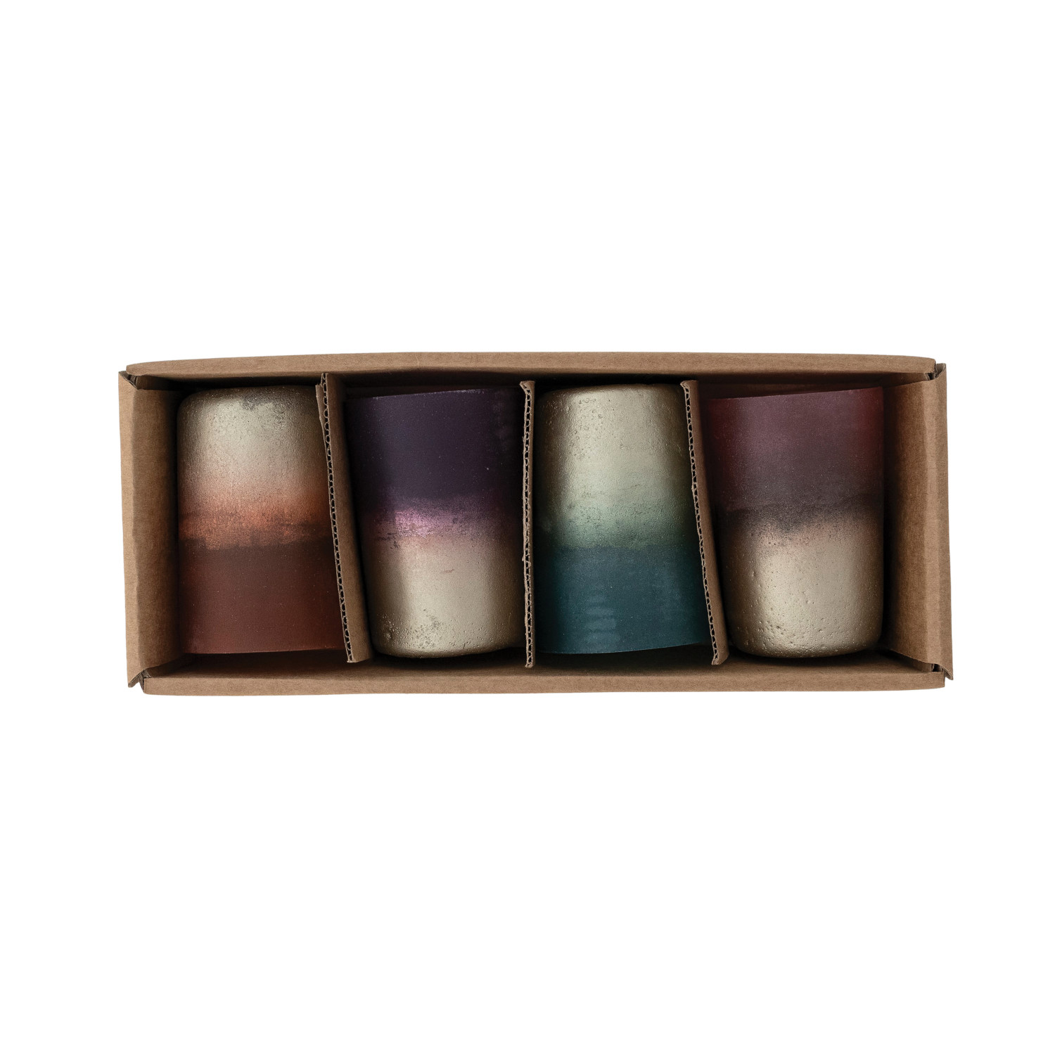 Catalog Name: 2-1/4" Round x 3-1/4"H Glass Metallic Frosted Tealight/Votive Holders, Multi Color Ombre, Boxed Set of 4