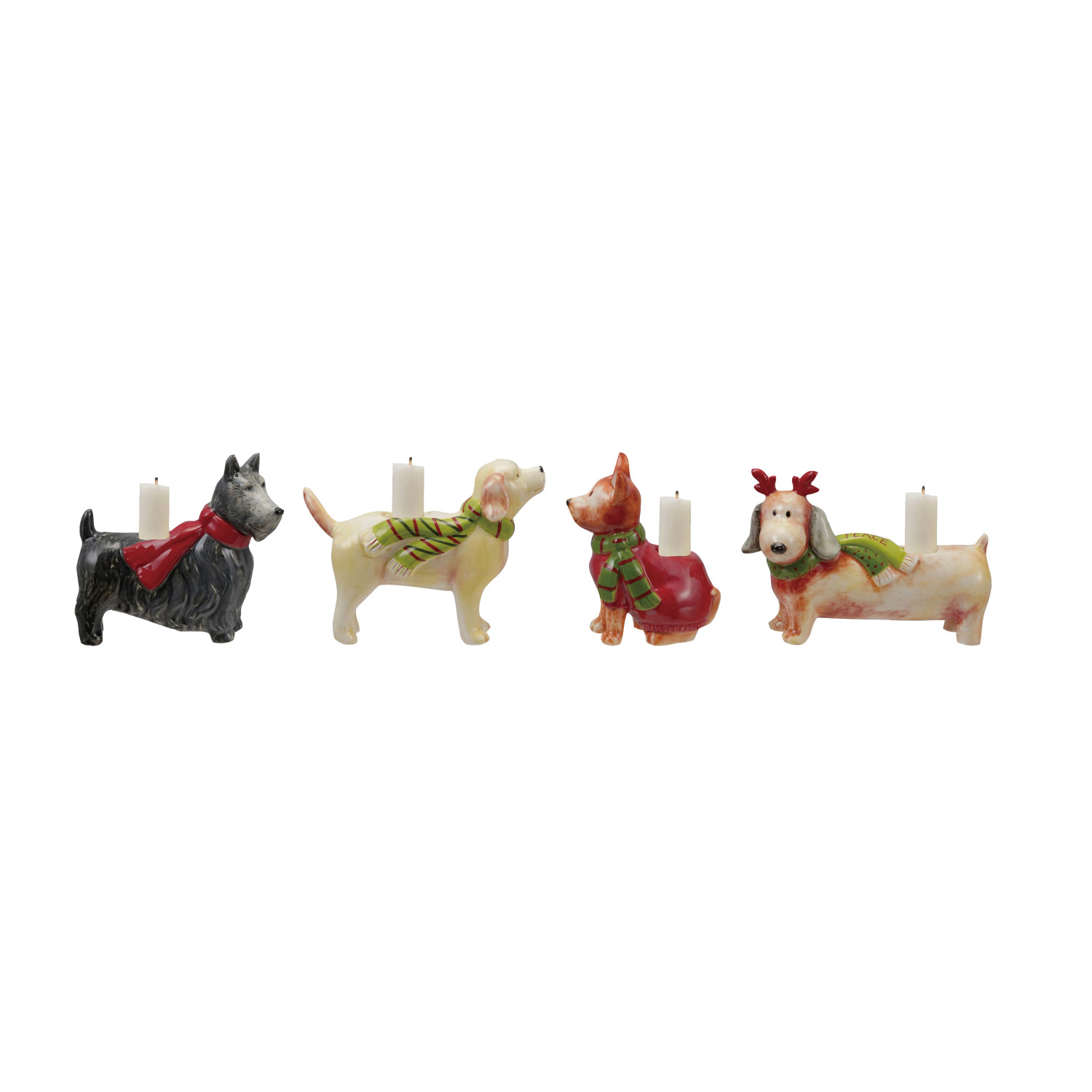 Catalog Name: 3-1/2"L - 5-1/2"L Hand-Painted Stoneware Dog Shaped Taper Holder w/ Scarf & Saying, Multi Color, 4 Styles ©