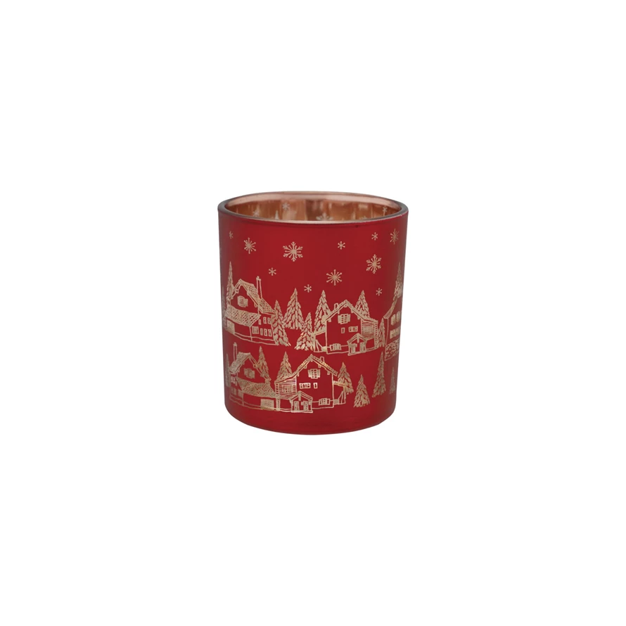 Catalog Name: 2-3/4" Round x 3"H Mercury Glass Tealight/Votive Holder w/ Laser Etched Scene, Red & Gold Finish