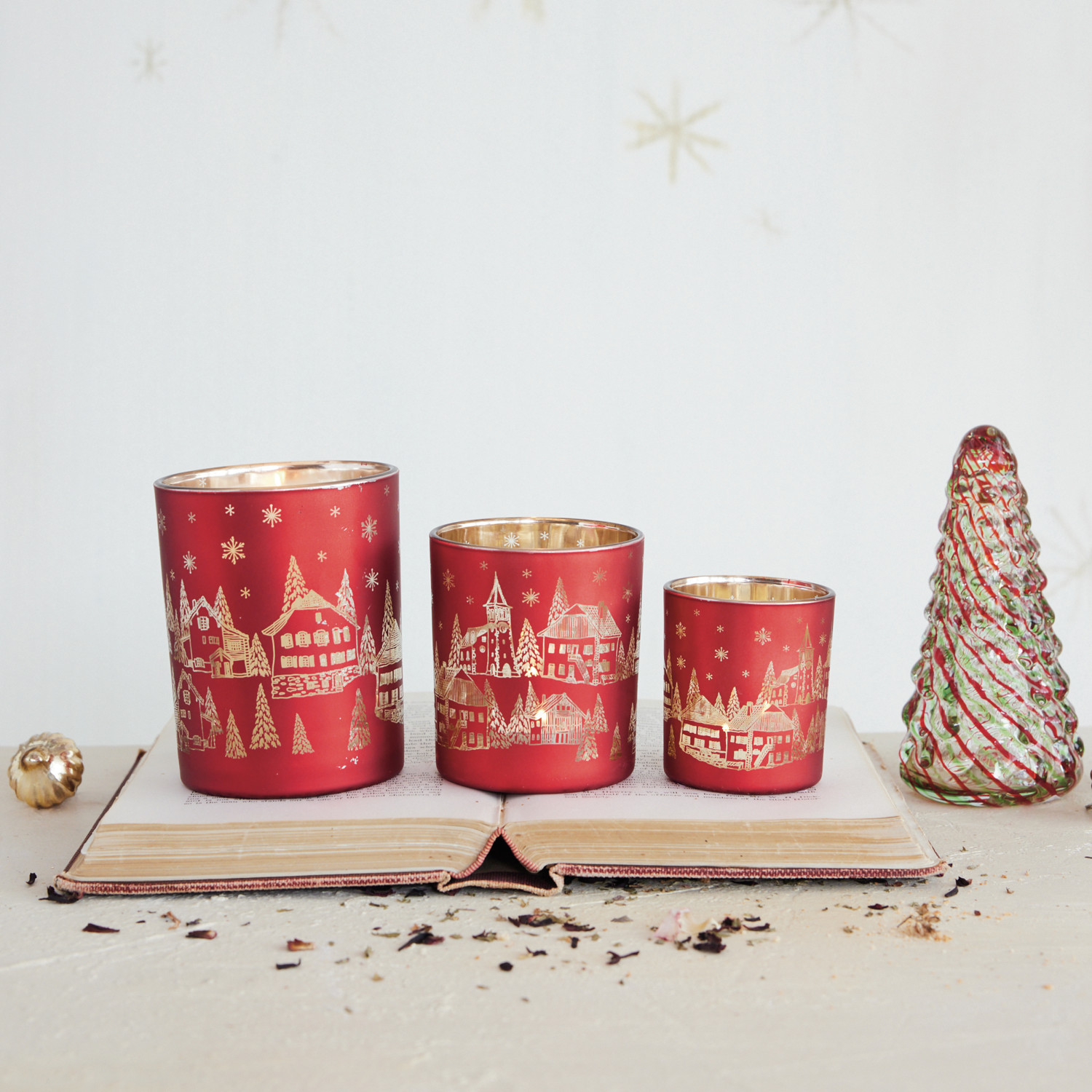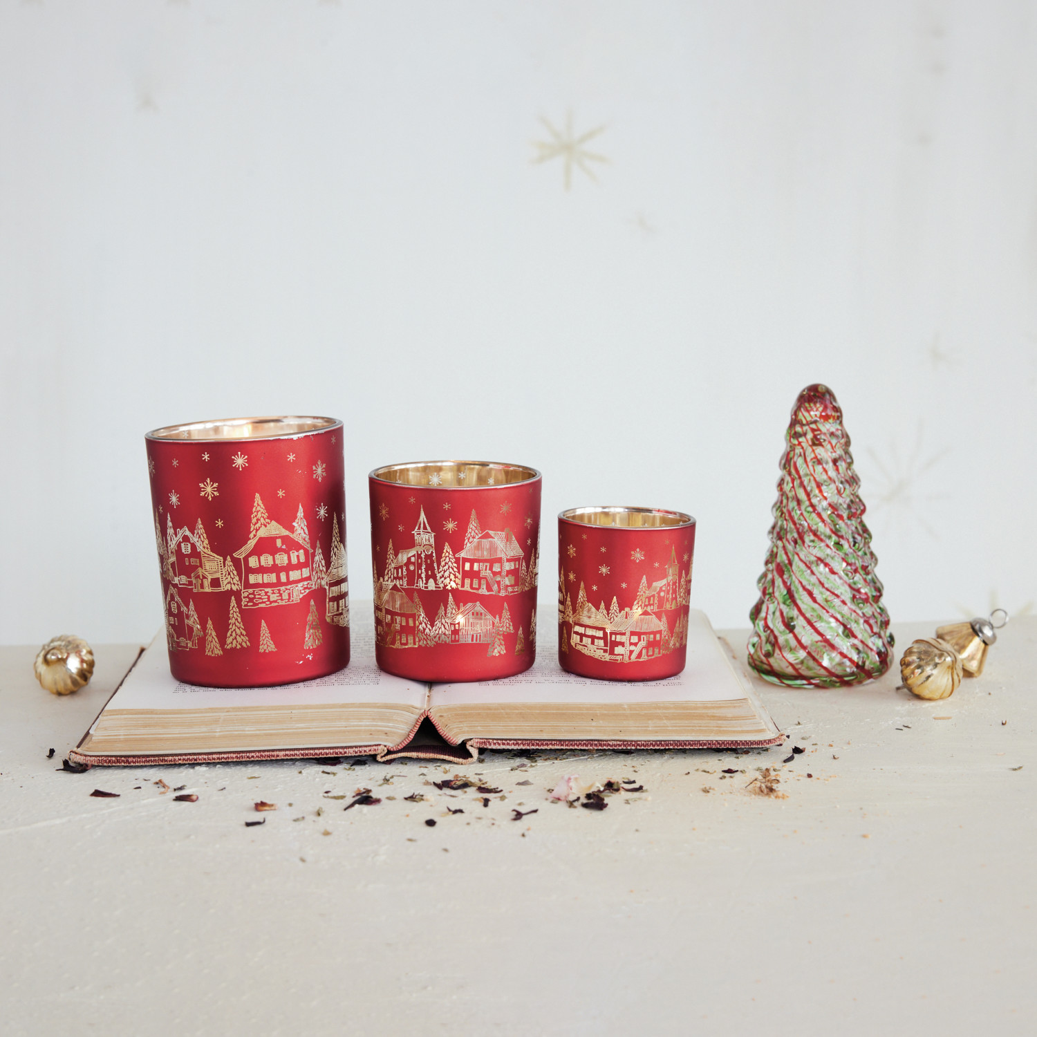 Mercury Glass Tealight/Votive Holder with Laser Etched Scene, Red & Gold Finish