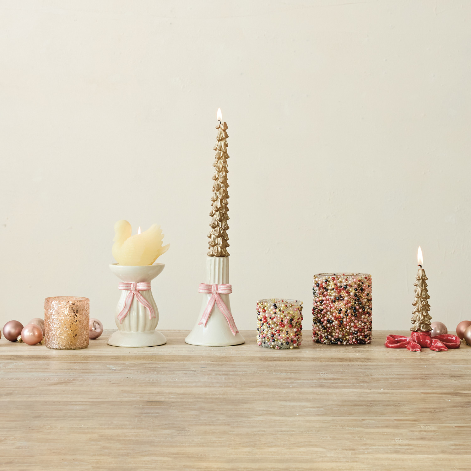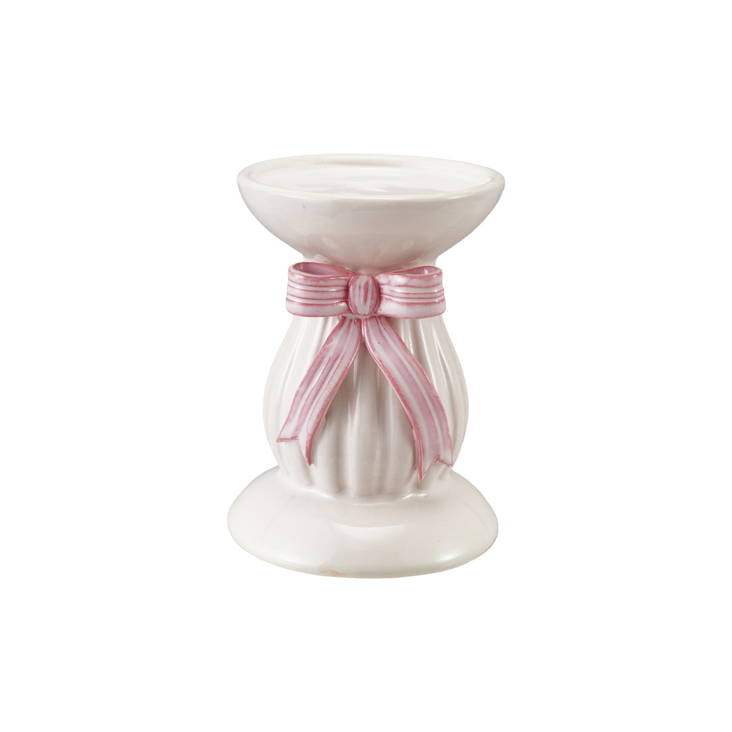 Hand-Painted Stoneware Fluted Pillar Holder with Bow, White & Pink (Holds 3" Pillar)