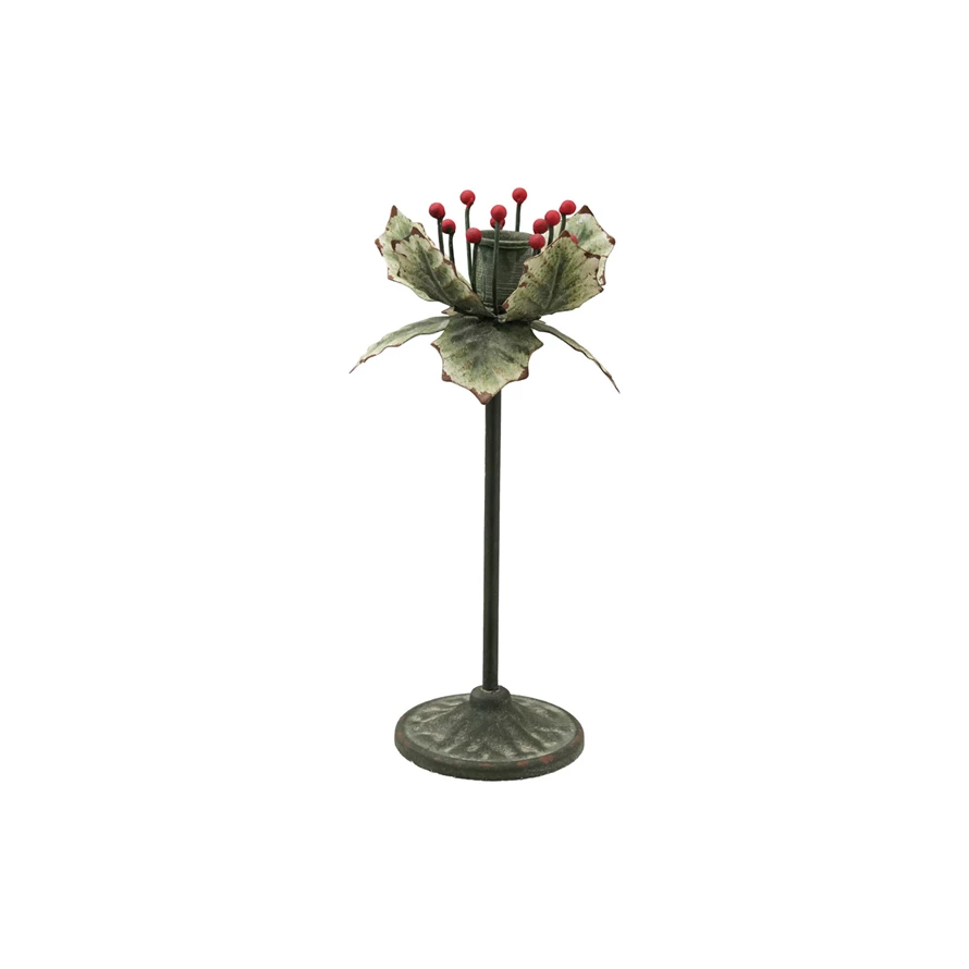Catalog Name: 4-1/4" Round x 9"H Painted Metal Holly Leaf Shaped Taper Holder, Distressed Finish, Green & Red