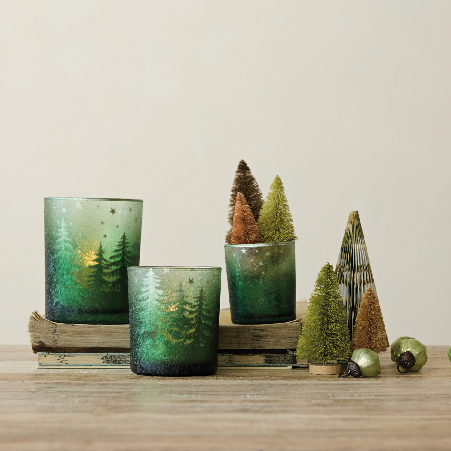 Catalog Name: 4" Round x 5"H Mercury Glass Tealight/Votive Holder w/ Laser Etched Scene, Green