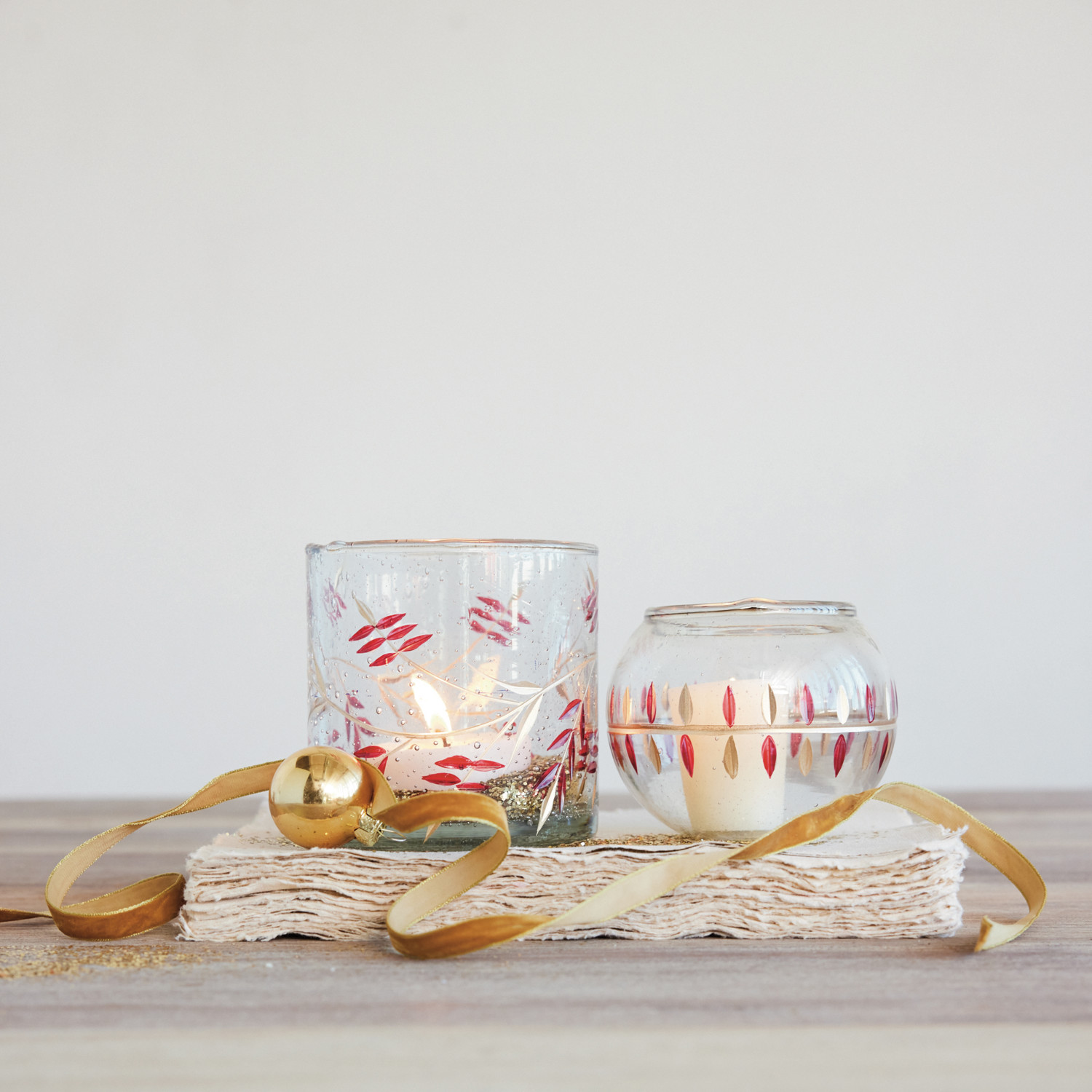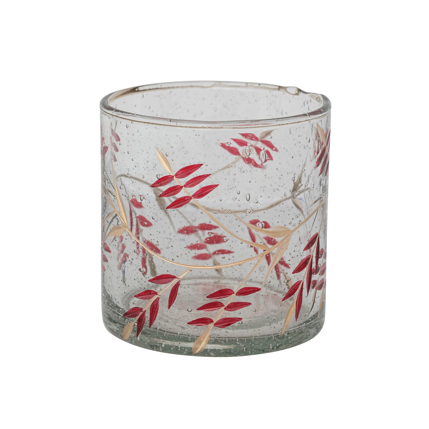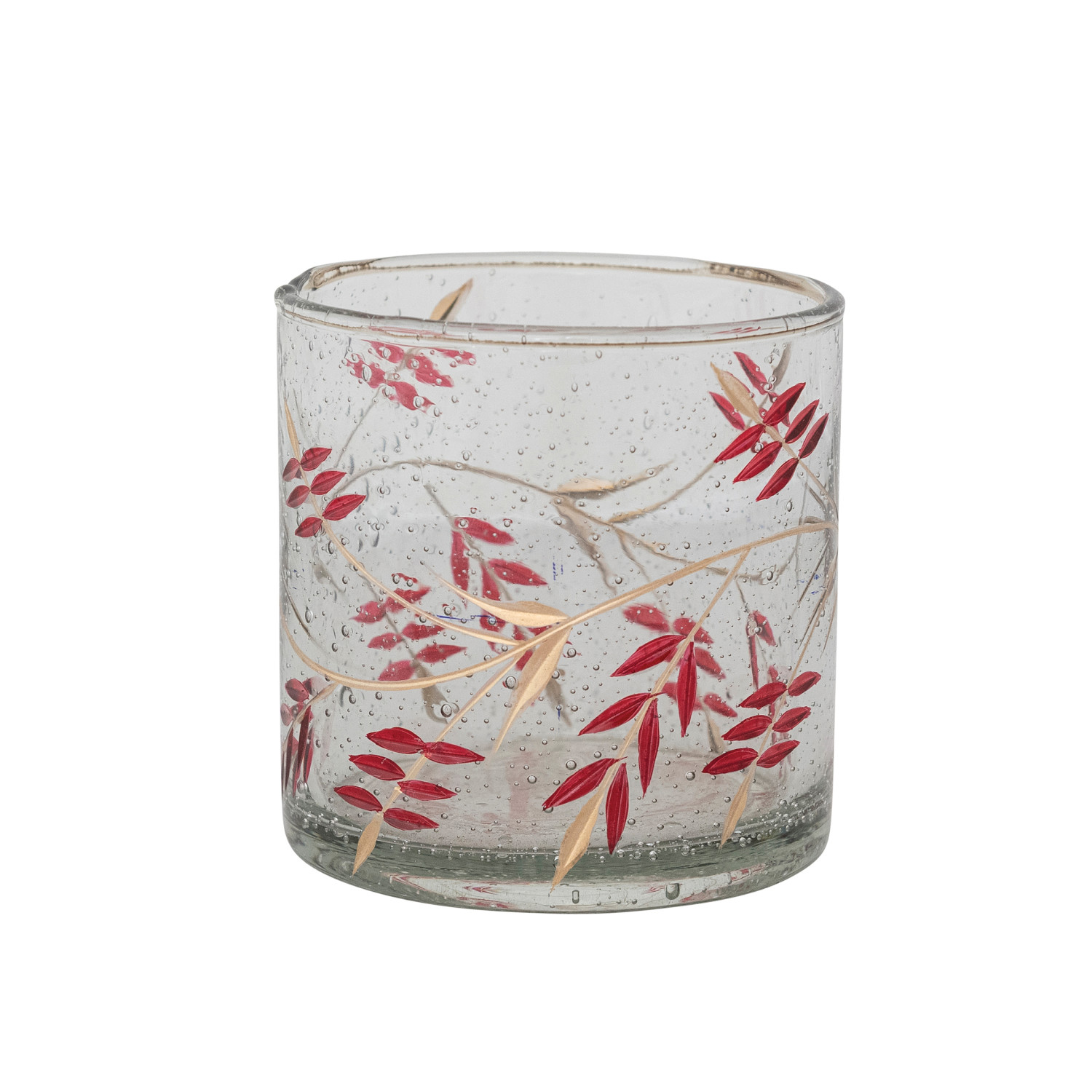 Hand-Painted Seeded Glass Votive Holder with Etched Vine Design, Red & Gold Finish