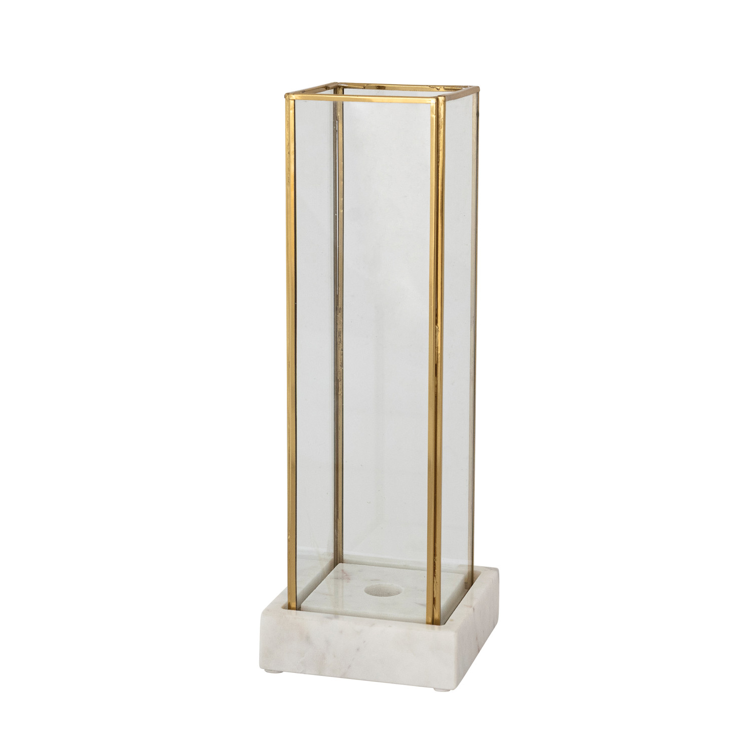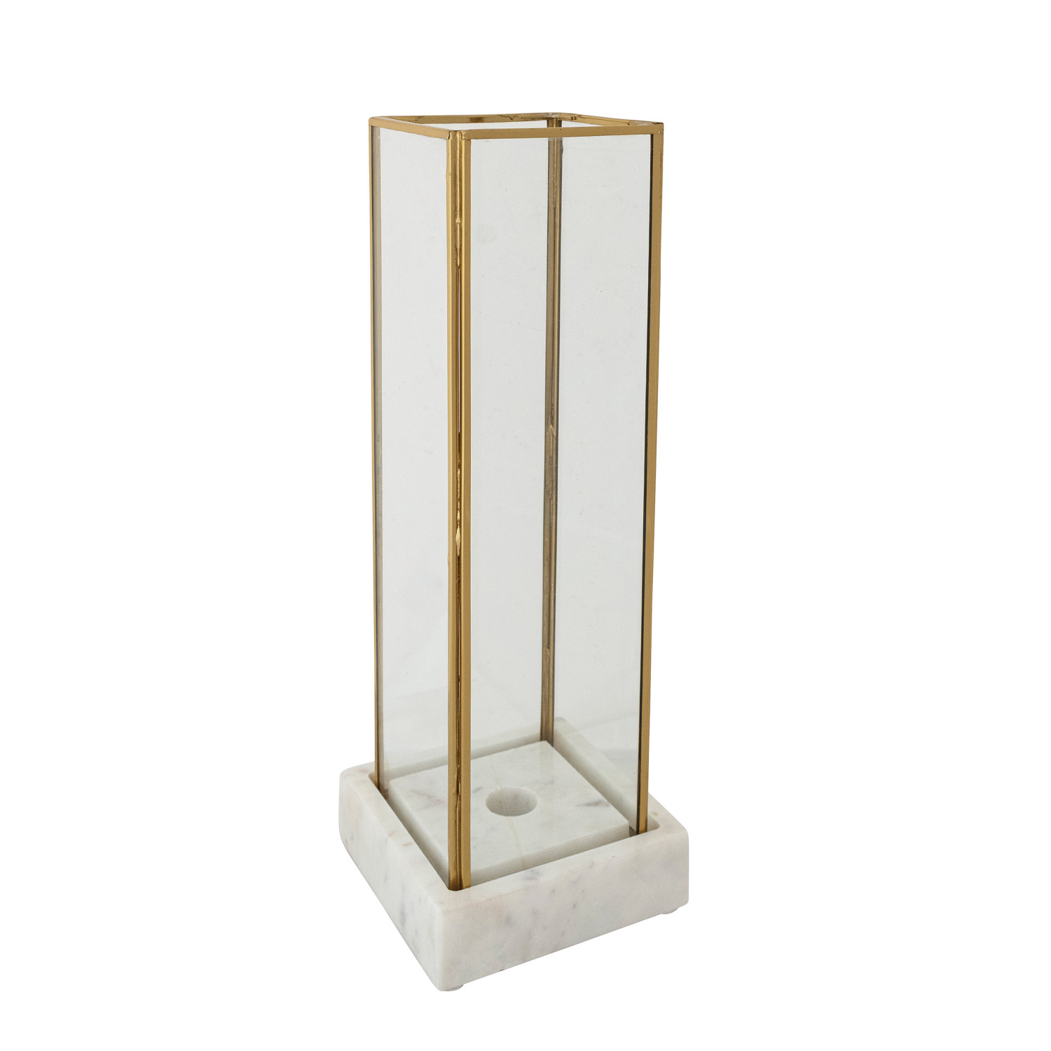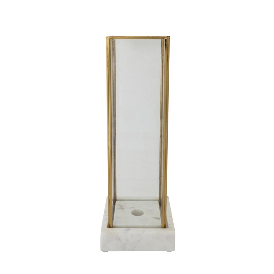 Catalog Name: 4-1/2" Square x 12-3/4"H Marble Taper Holder w/ Glass & Brass Hurricane, White, Set of 2