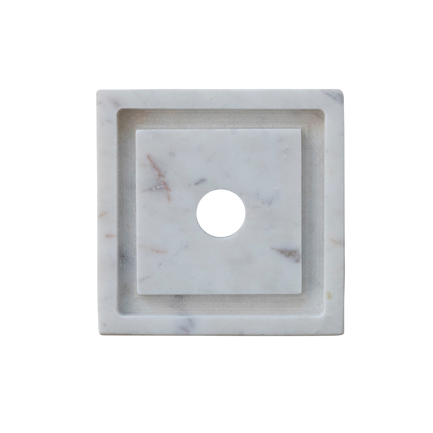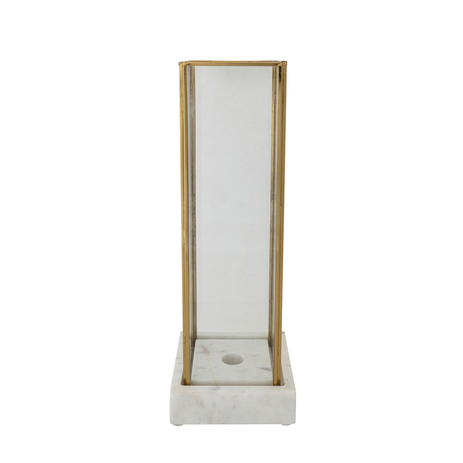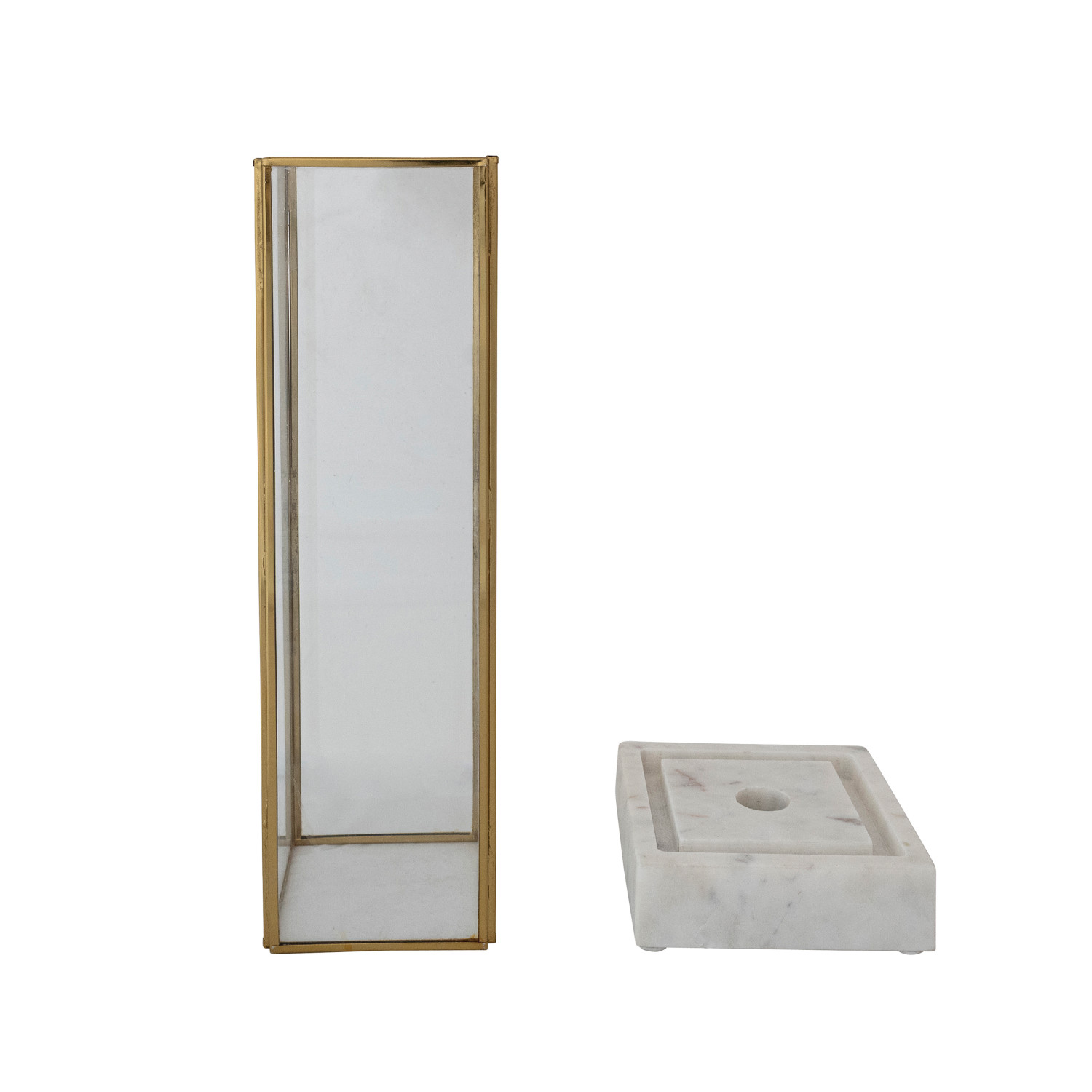 Catalog Name: 4-1/2" Square x 12-3/4"H Marble Taper Holder w/ Glass & Brass Hurricane, White, Set of 2