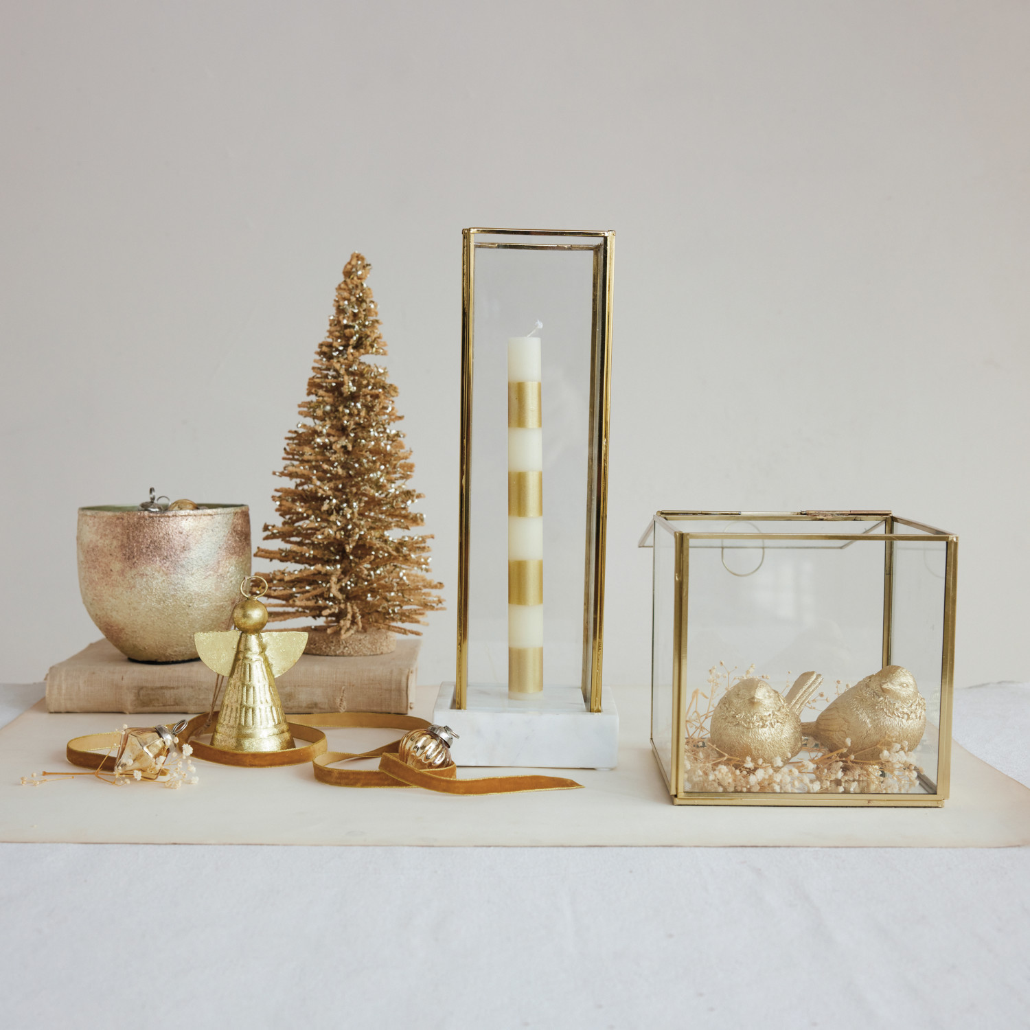 Marble Taper Holder with Glass & Brass Hurricane, White, Set of 2