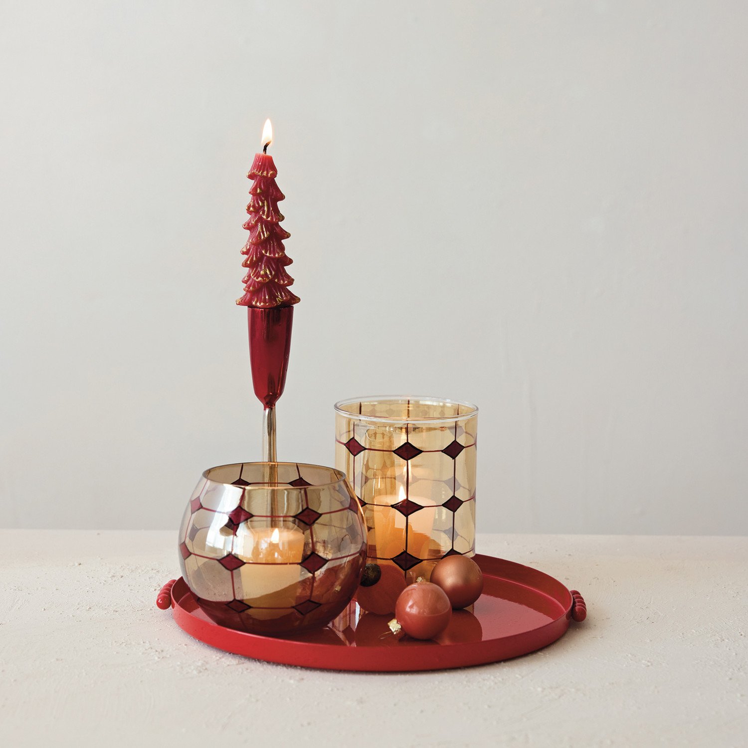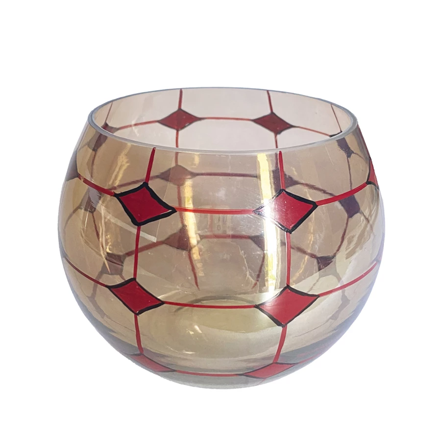 Catalog Name: 4-3/4" Round x 3-3/4"H Hand-Blown Glass Tealight/Votive Holder w/ Hand-Painted Grid & Diamond Pattern, Pearlized Finish, Red & Black