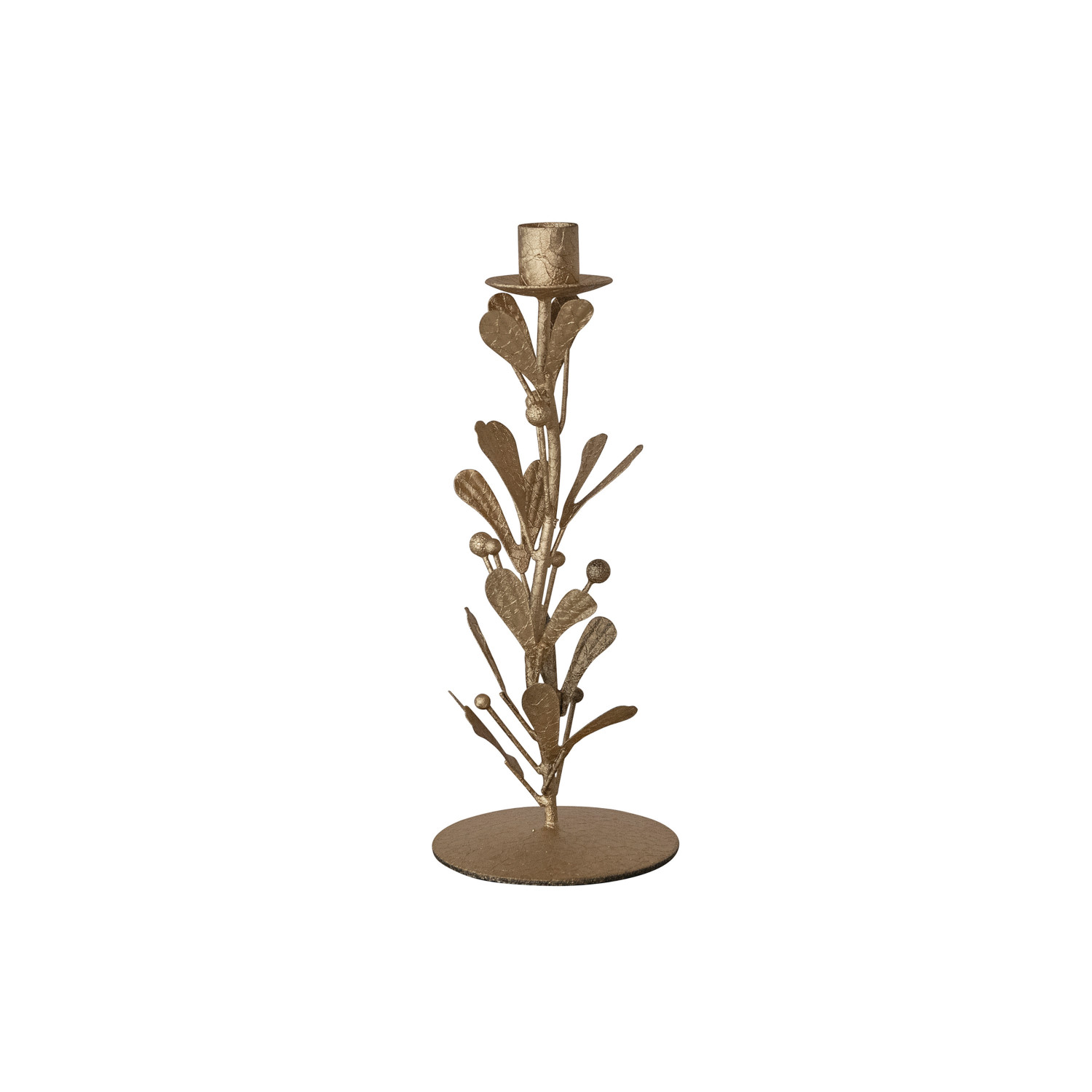 Catalog Name: 4" Round x 10"H Handmade Metal & Acrylic Bead Mistletoe Taper Holder, Distressed Antique Gold Finish