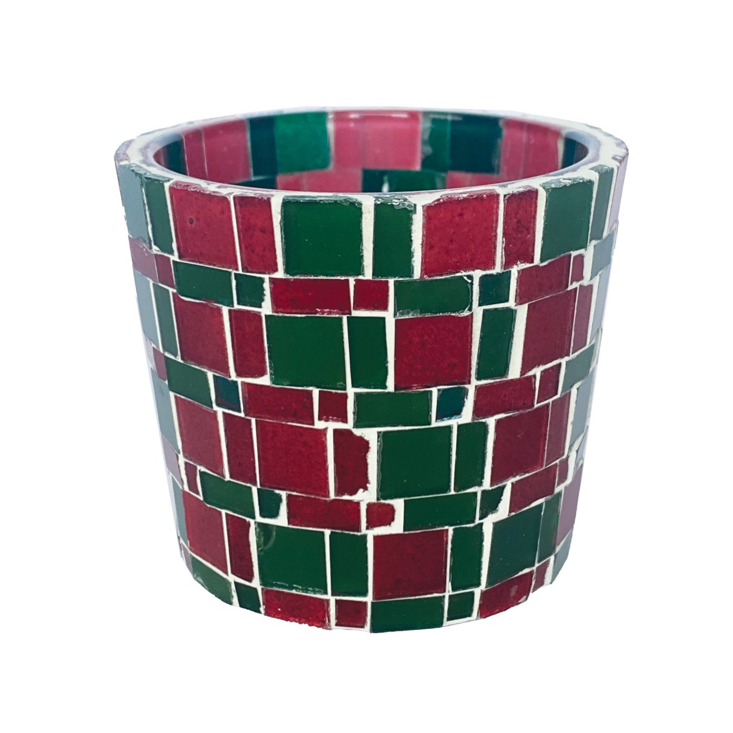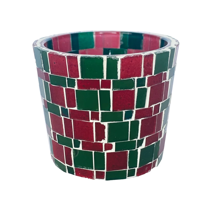Catalog Name: 2-1/2" Round x 2-1/4"H Recycled Glass Mosaic Tealight/Votive Holder, Red, Green & White