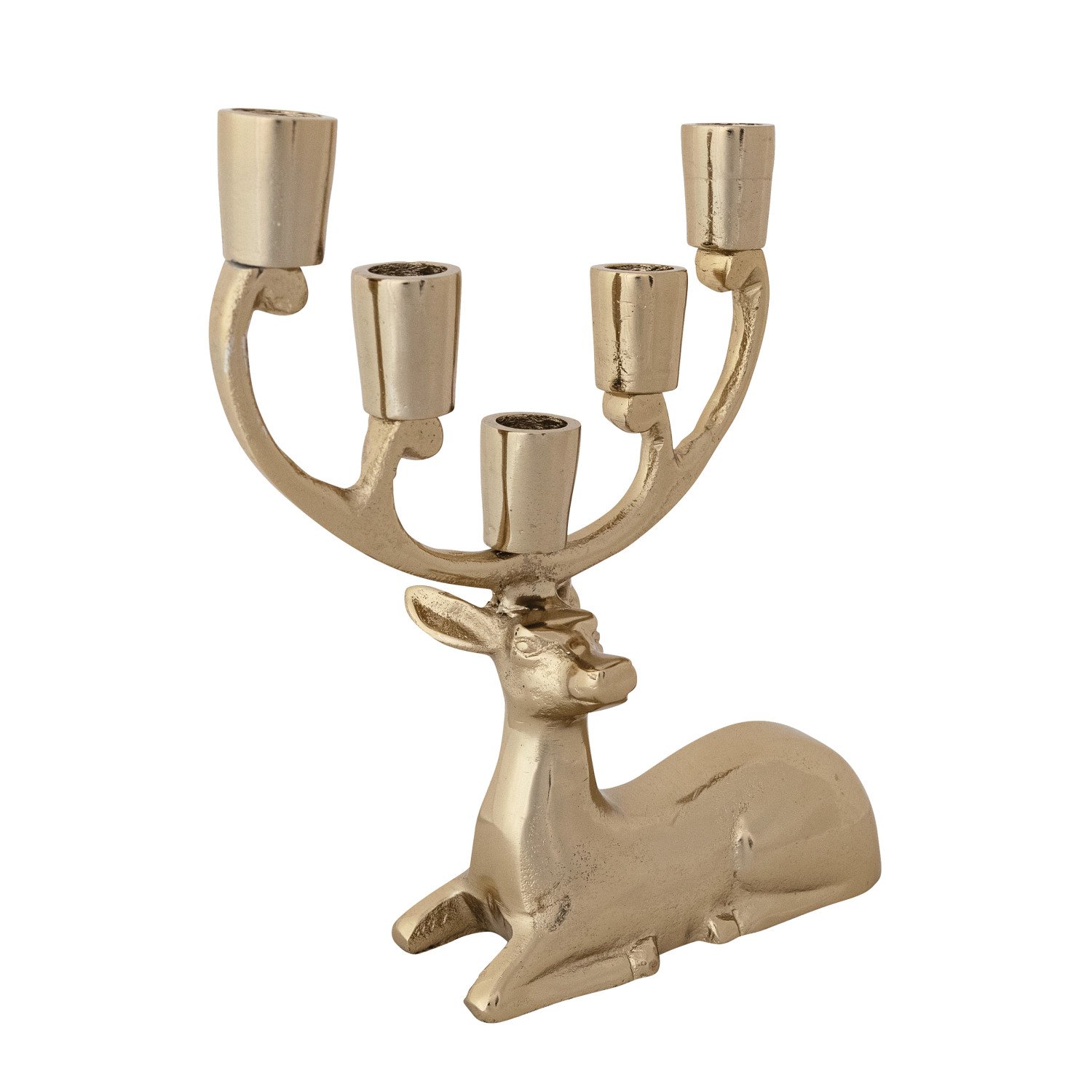 Catalog Name: 9-1/2"L x 3"W x 10-1/4"H Cast Aluminum Deer Candelabra, Gold Finish (Holds 5 Tapers)
