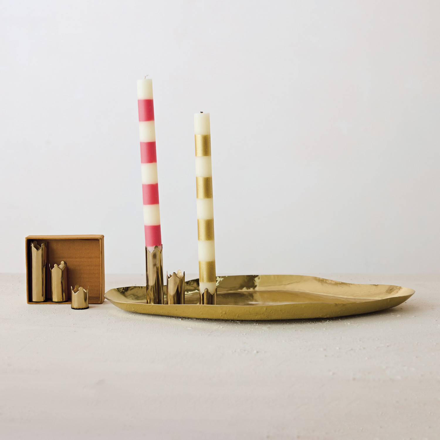 Catalog Name: (2) 3"H, (2) 2"H & (2) 1-1/4"H Metal Magnetic Crown Shaped Taper Holders, Gold Finish, Boxed Set of 6