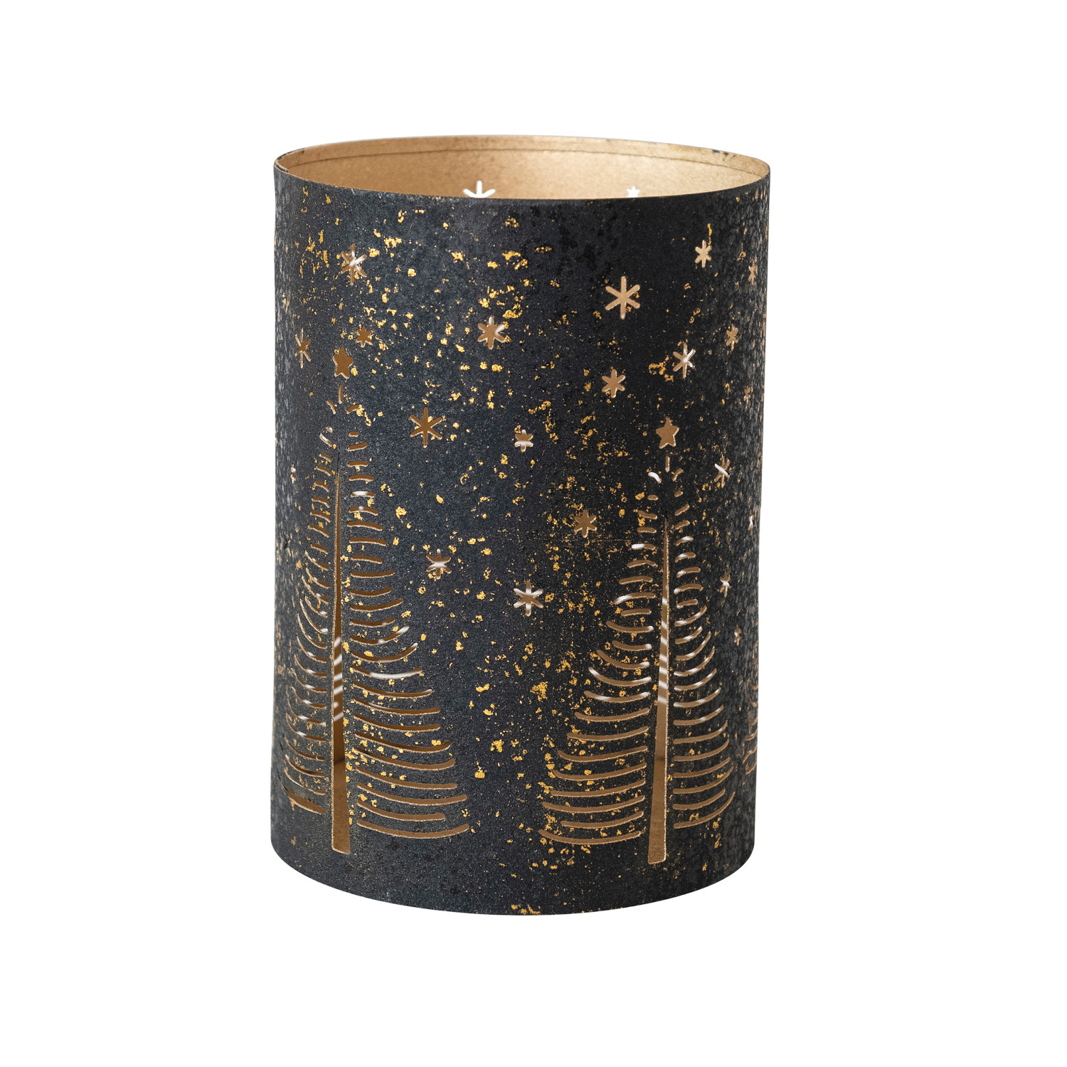 Textured Metal Hurricane with Laser Cut Stars & Trees, Black & Gold Finish