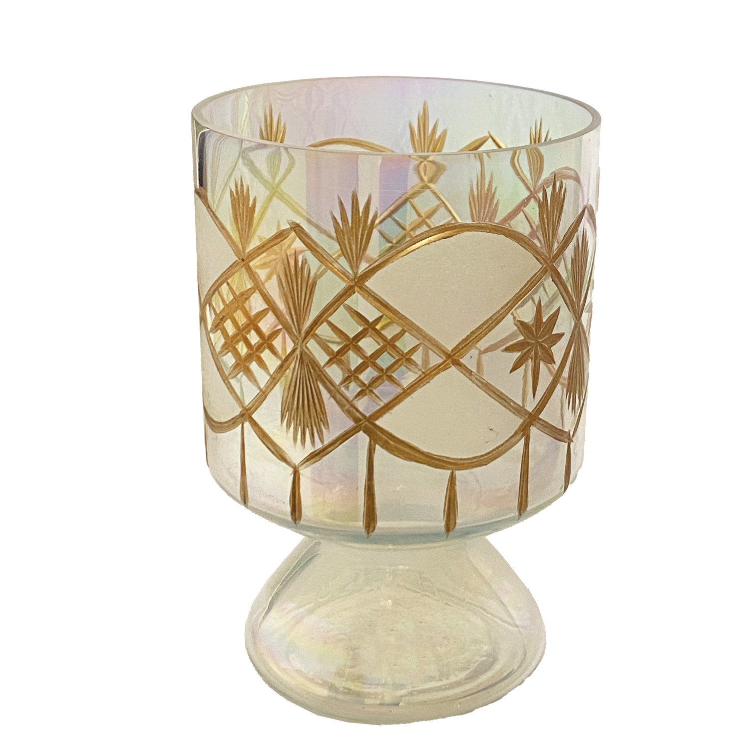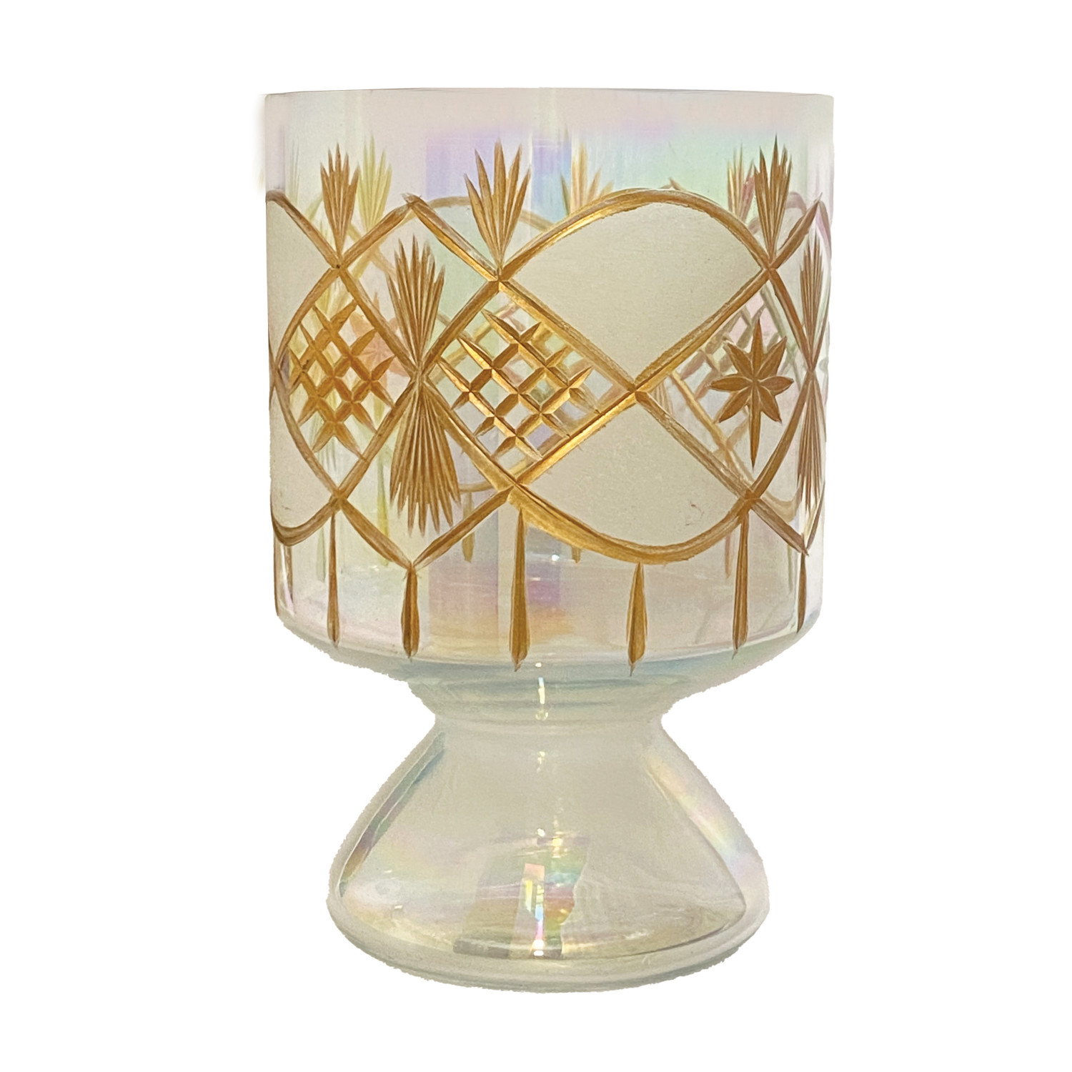 Hand-Blown Etched Glass Footed Tealight/Votive Holder with Design, Iridescent & Gold Finish