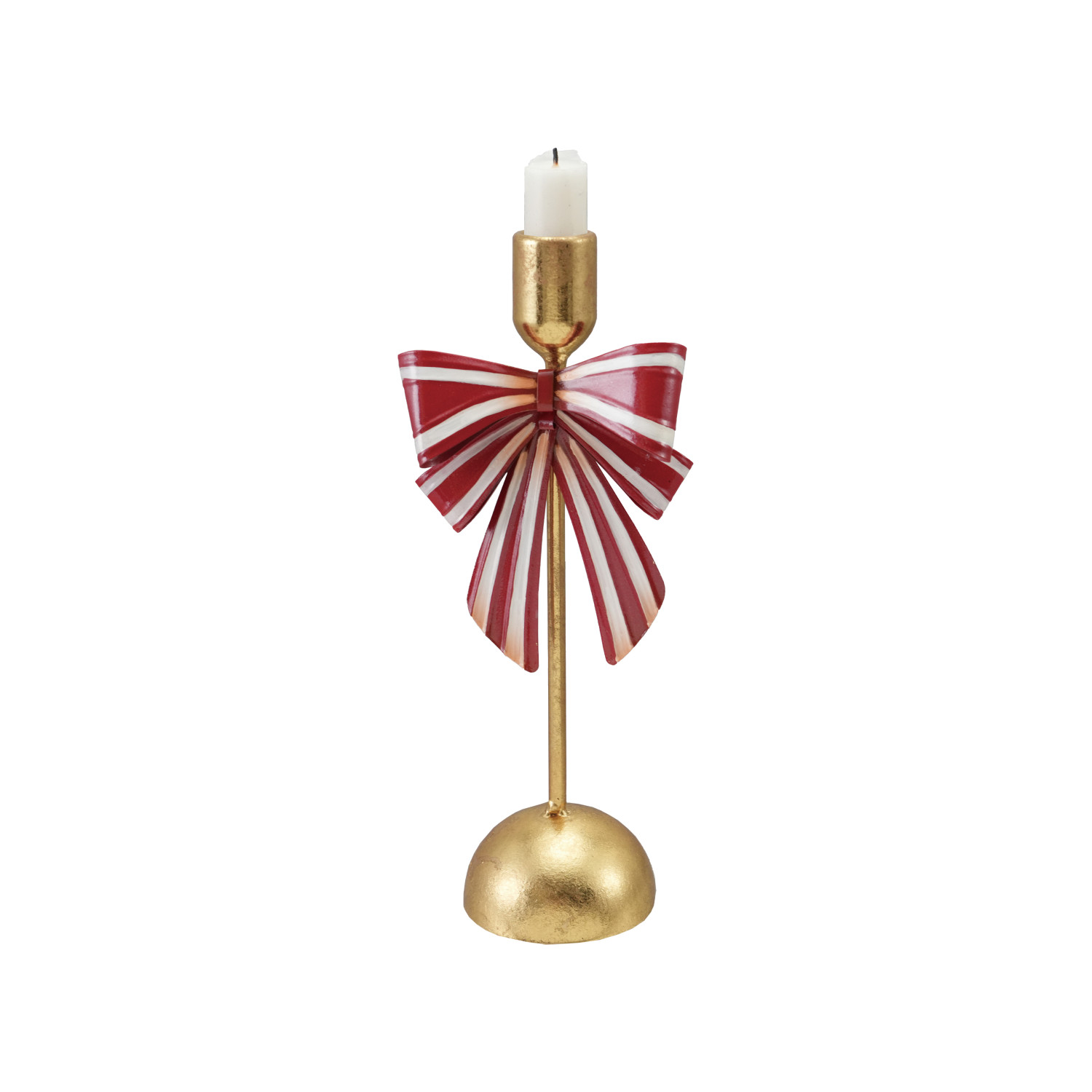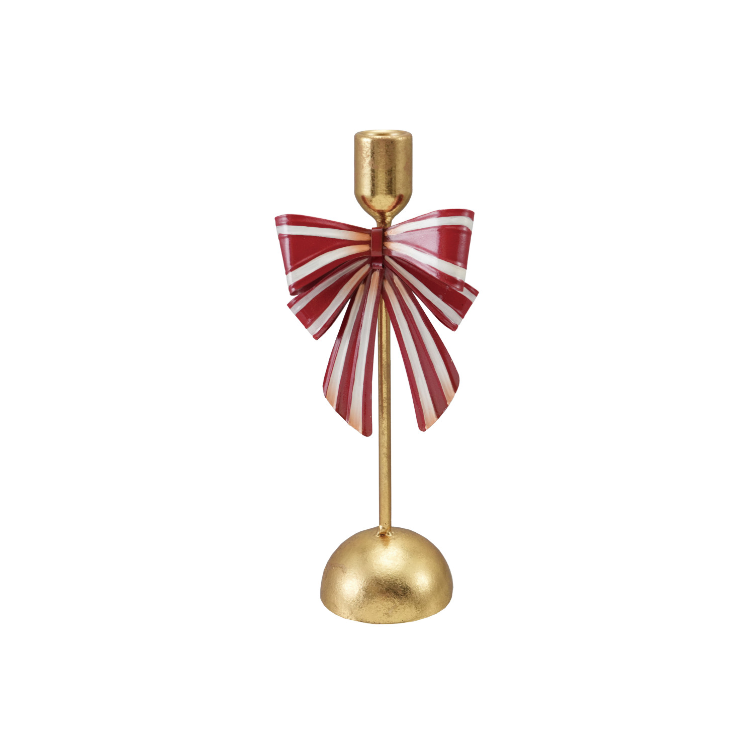 Metal Taper Holder with Striped Bow, Gold Finish, Red & White