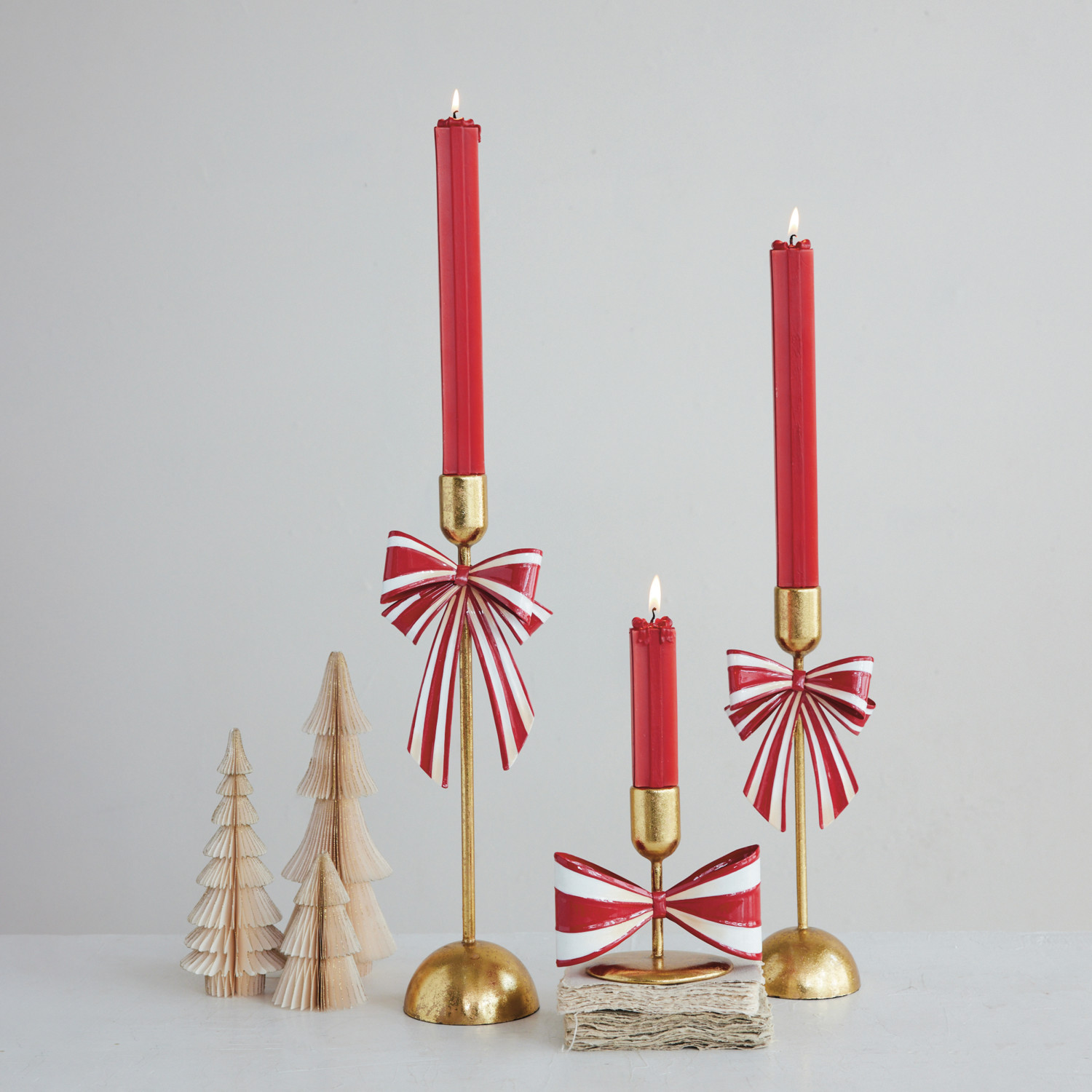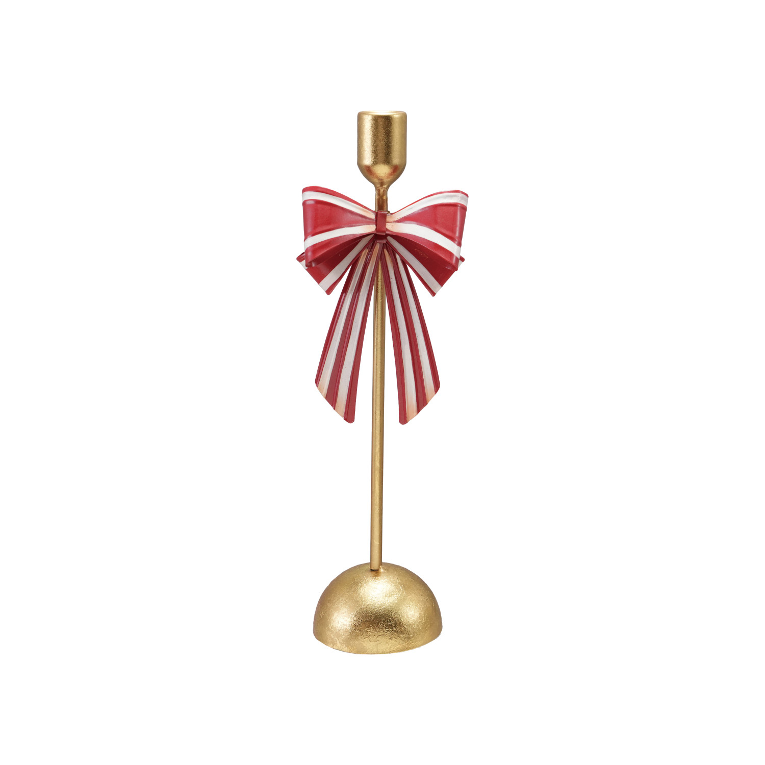 Metal Taper Holder with Striped Bow, Gold Finish, Red & White