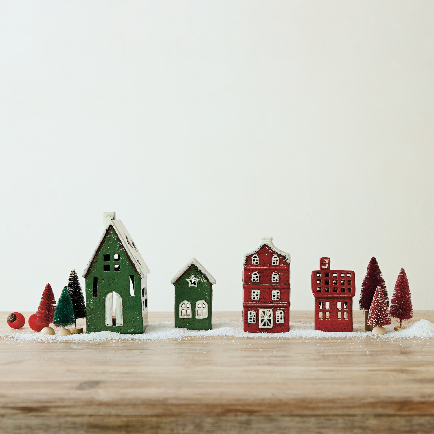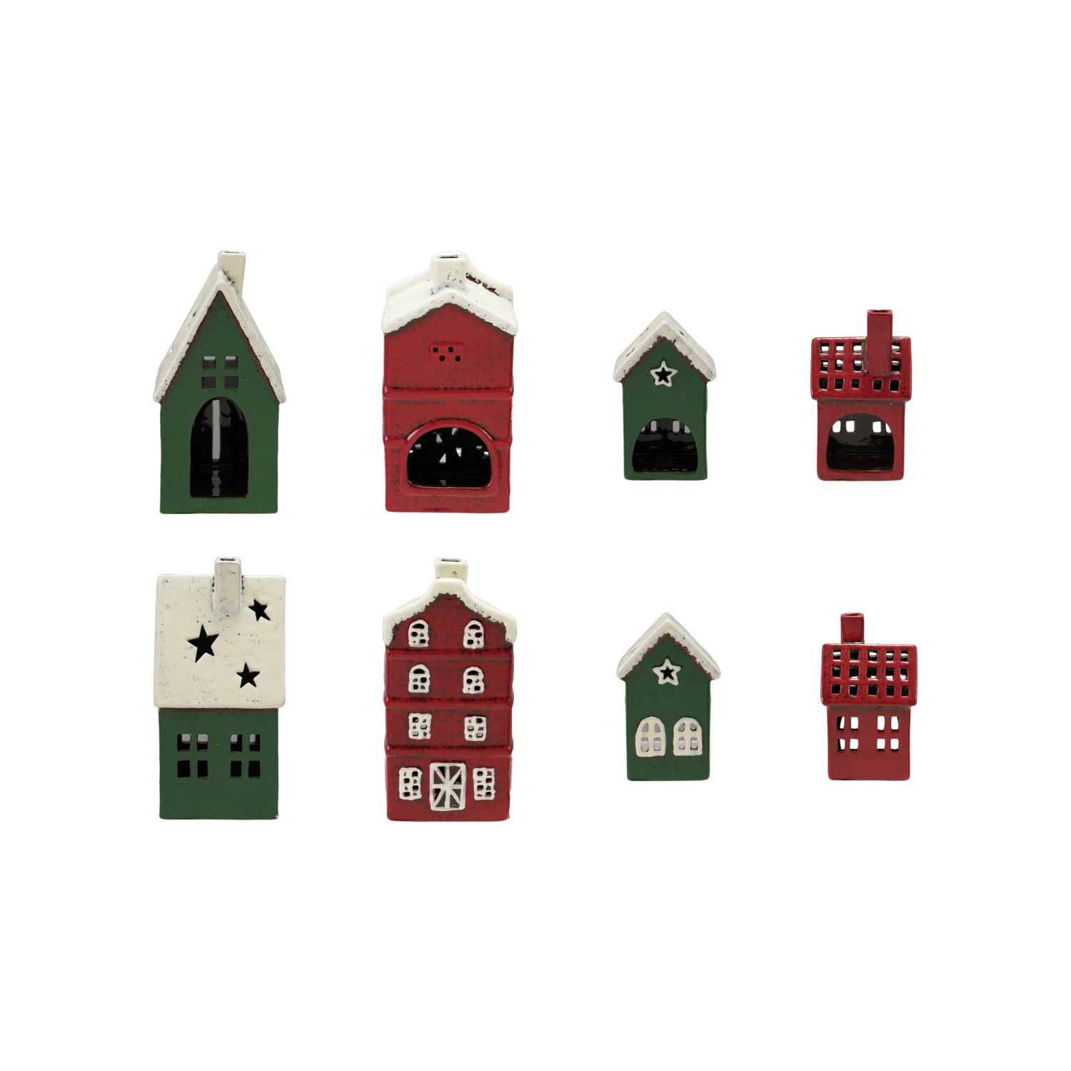 Catalog Name: 4-1/2"H - 7-3/4"H Hand-Painted Ceramic House Shaped Tealight Holders, Reactive Glaze, Red, Green & White, Set of 4 (Each One Will Vary)