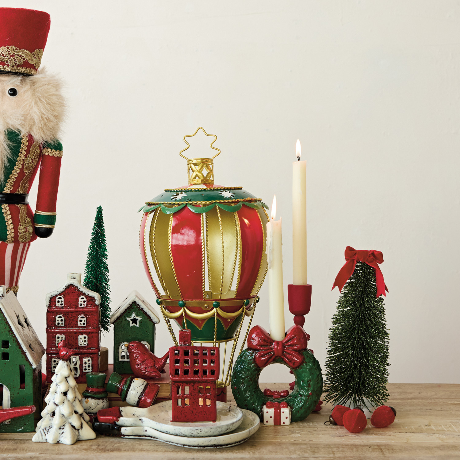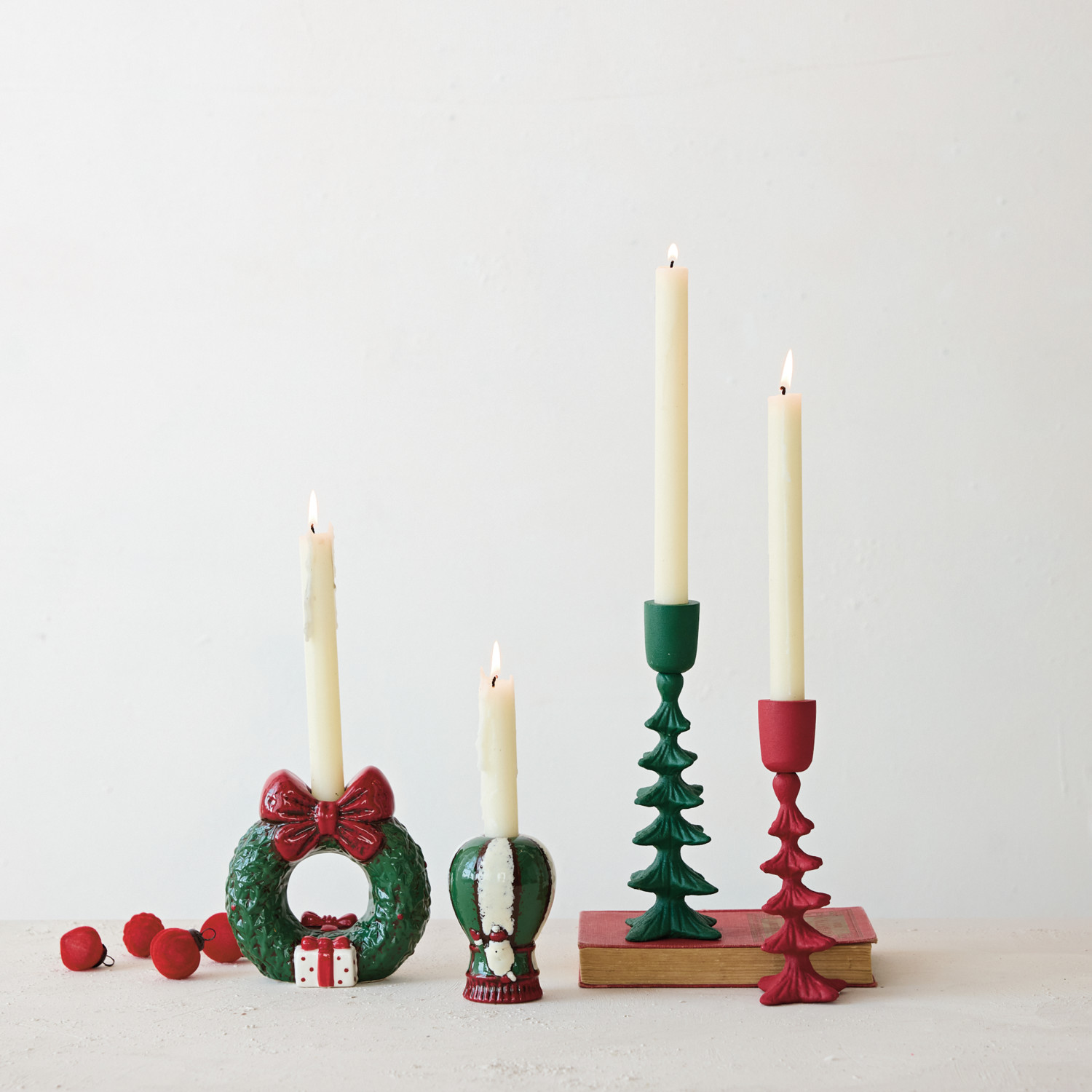 Catalog Name: 5-1/4" Round Hand-Painted Ceramic Wreath Shaped Taper Holder w/ Bow, Reactive Glaze, Green, Red & White (Each One Will Vary)