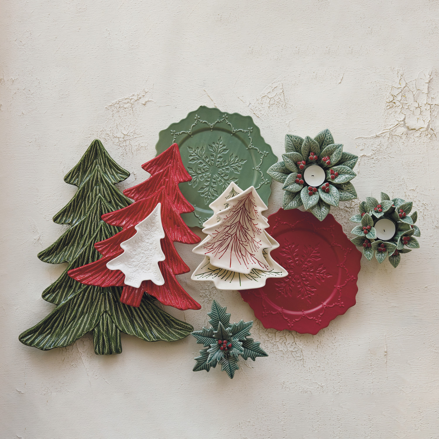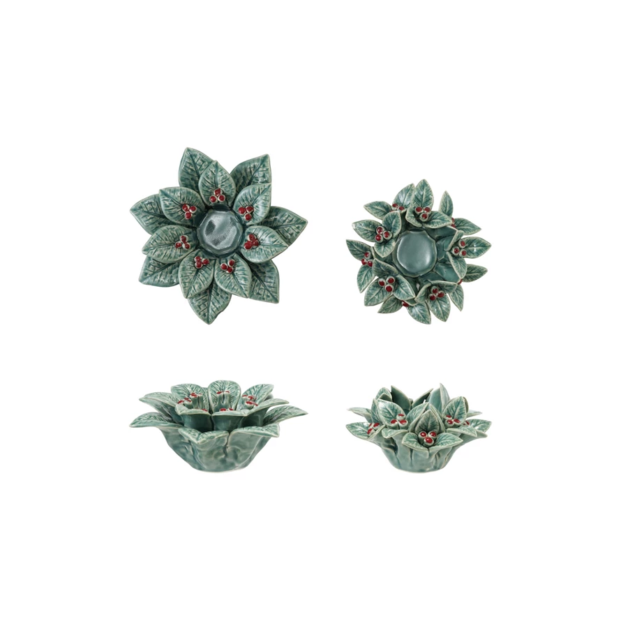 Catalog Name: 6-1/2" Round x 2-3/4"H & 5-1/2" Round x 3"H Ceramic Holly Leaves & Berries Shaped Tealight Holder, Reactive Glaze, Green & Red, 2 Styles (Each One Will Vary)