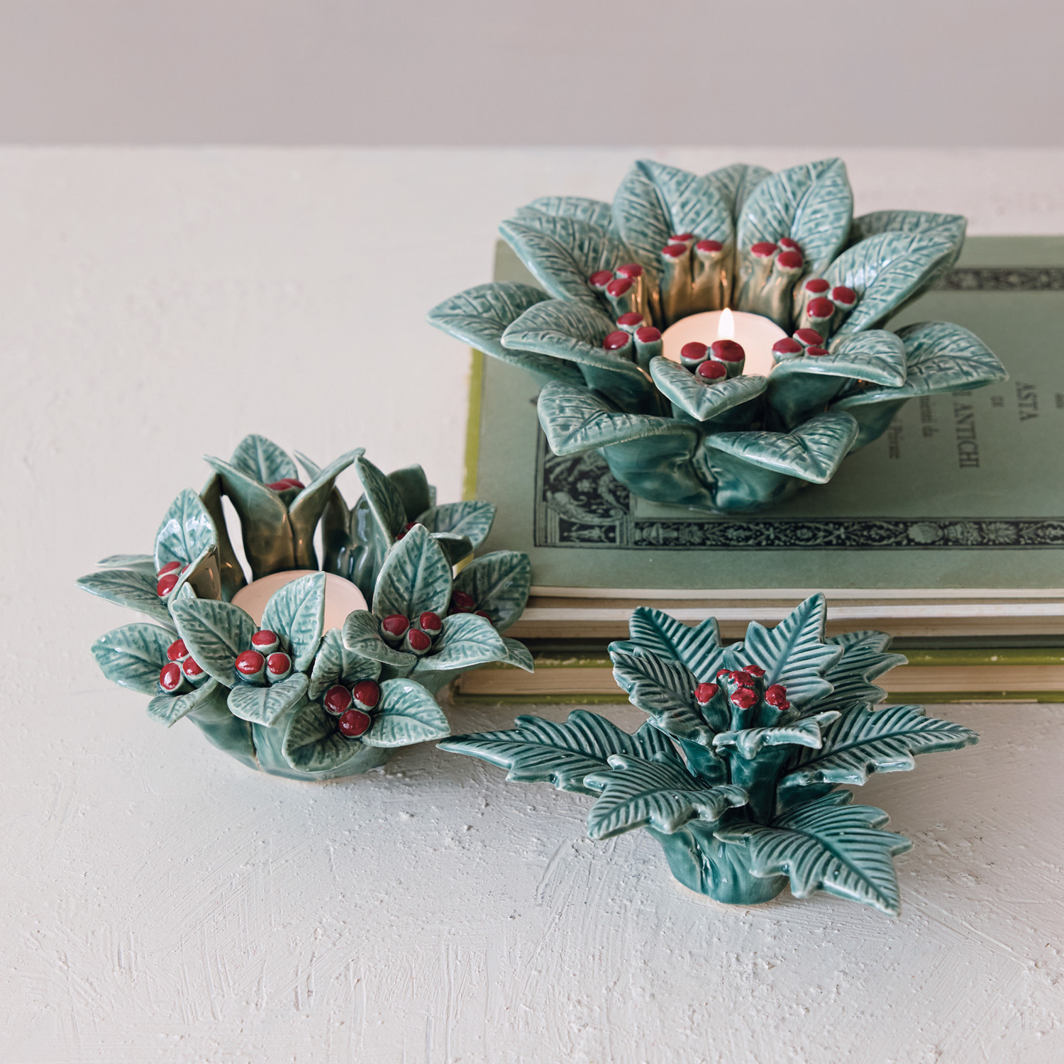 Ceramic Holly Leaves & Berries Shaped Tealight Holder, 2 Styles (Each One Will Vary)