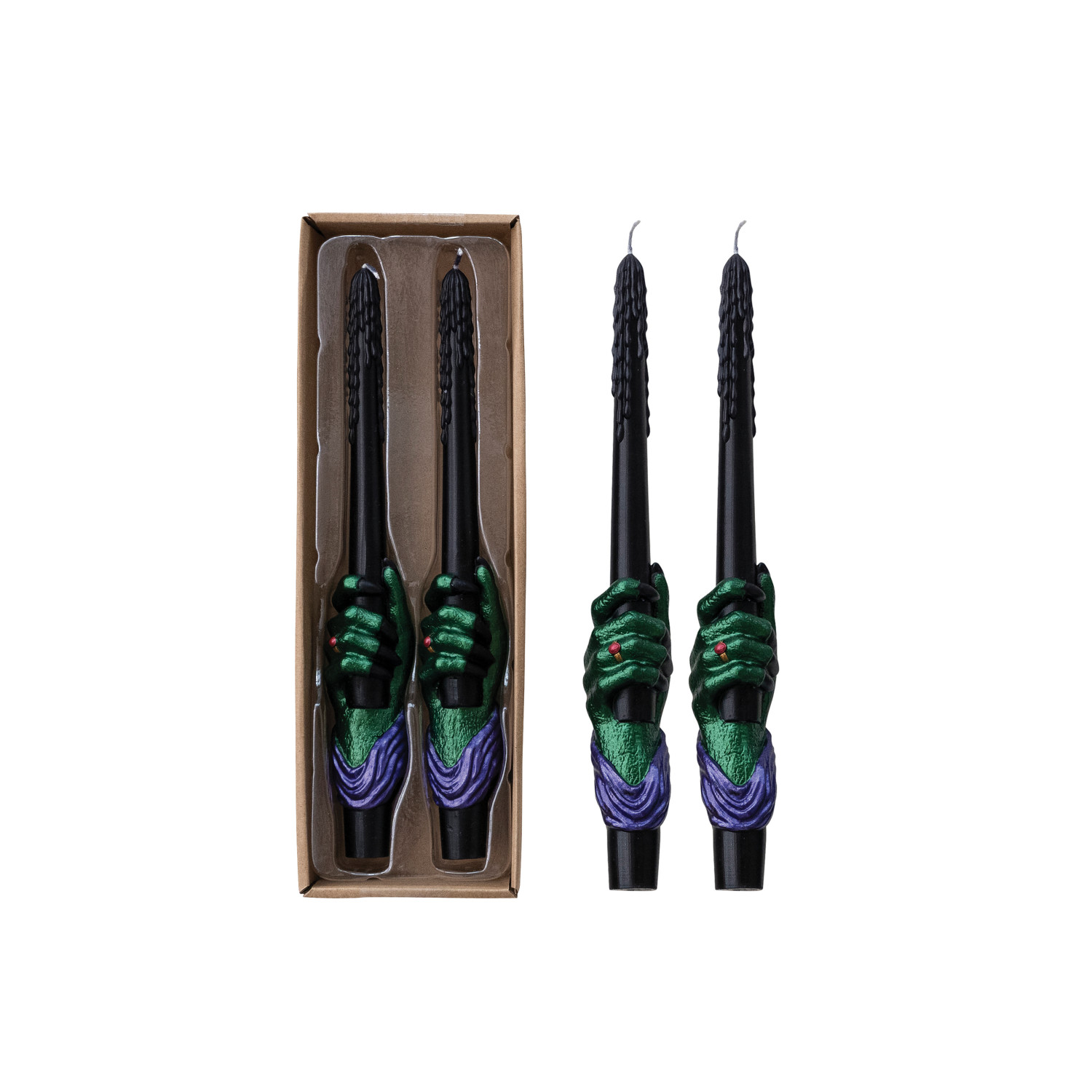 Unscented Taper Candles with Witch's Hand in Box, Black, Green & Purple, Set of 2