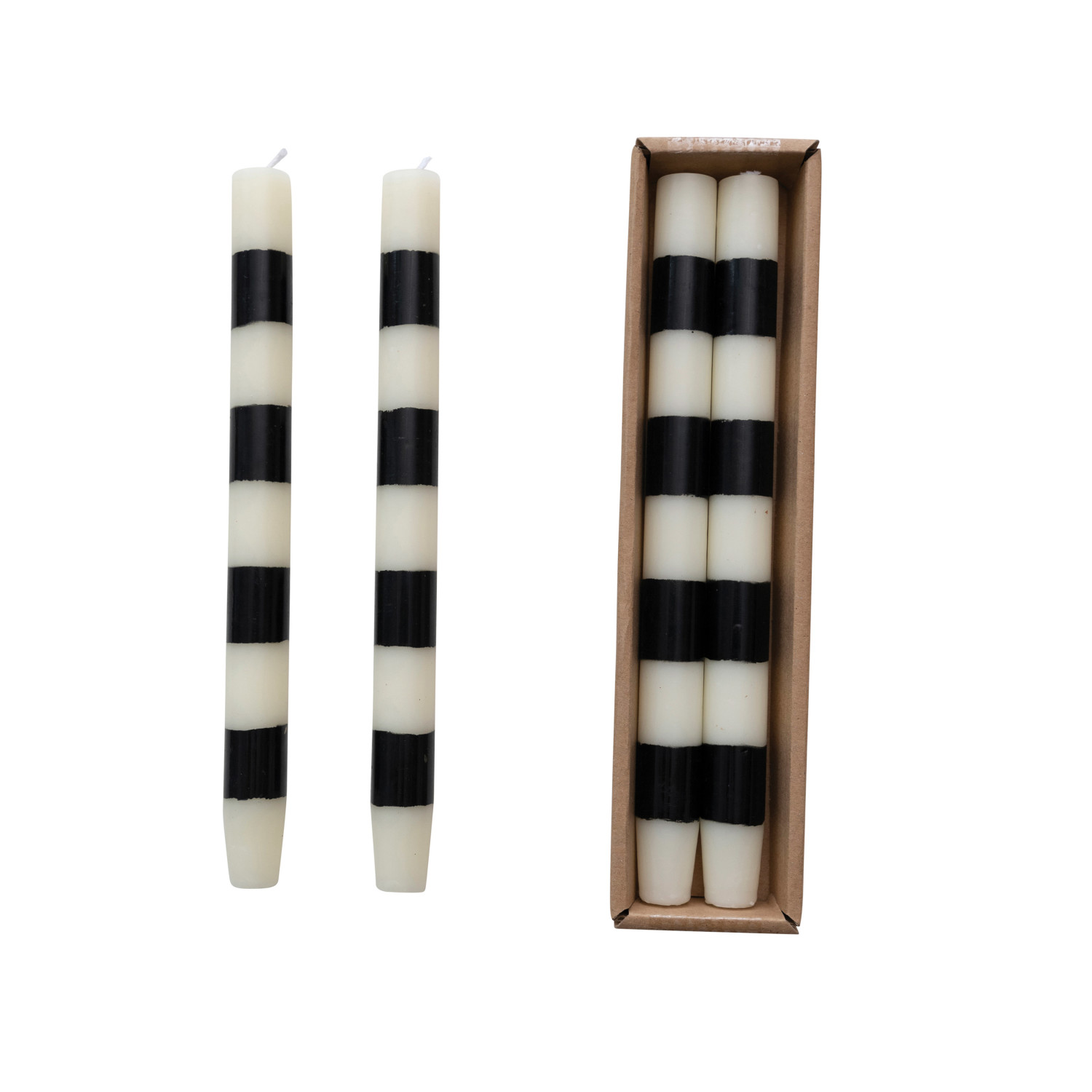 Catalog Name: 10"H Unscented Taper Candles w/ Stripes in Box, Cream Color & Black, Set of 2 (Est. Burn Time 15 Hours)
