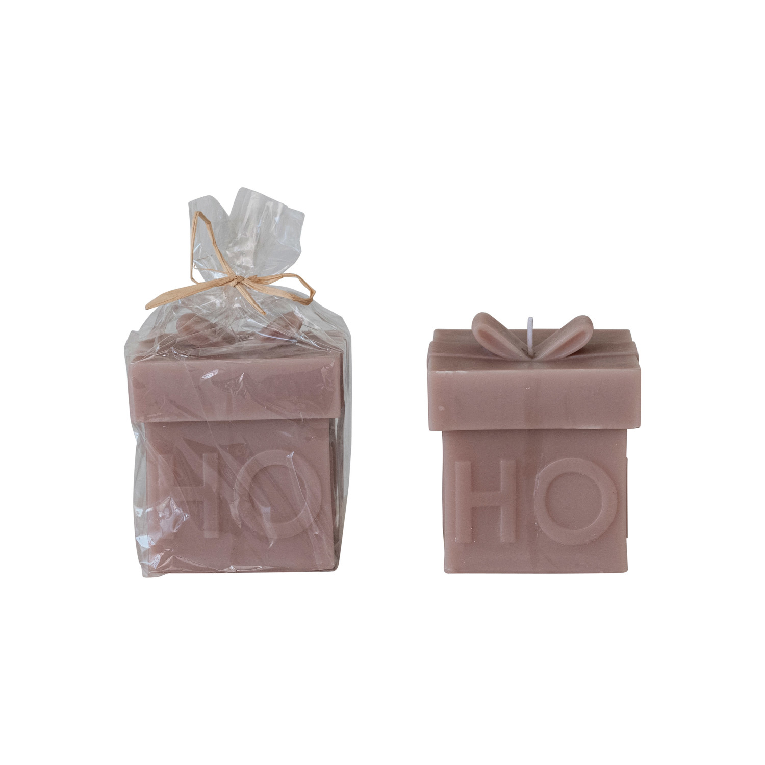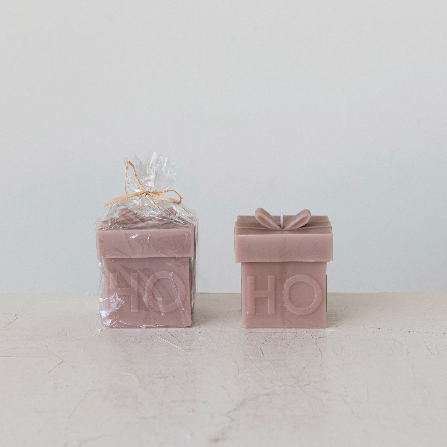 Catalog Name: 3-1/2" Square x 4"H Unscented Gift Box Shaped Candle "Ho Ho Ho", Khaki Color (Approximate Burn Time 50 Hours)