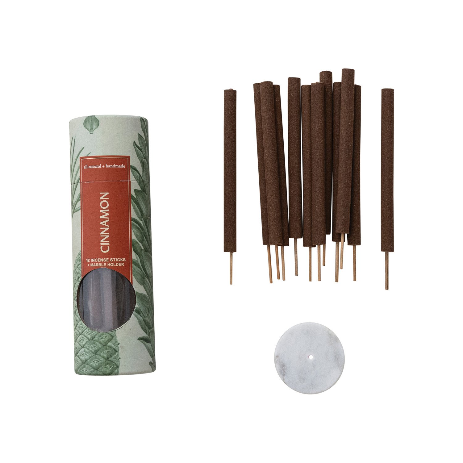 Catalog Name: 6"L 12 Piece All Natural Handmade Cinnamon Scented Thick Incense Sticks in Printed Tube w/ 2" Round White Marble Incense Holder, Set of 13 (Est. Burn Time 45 Minutes)