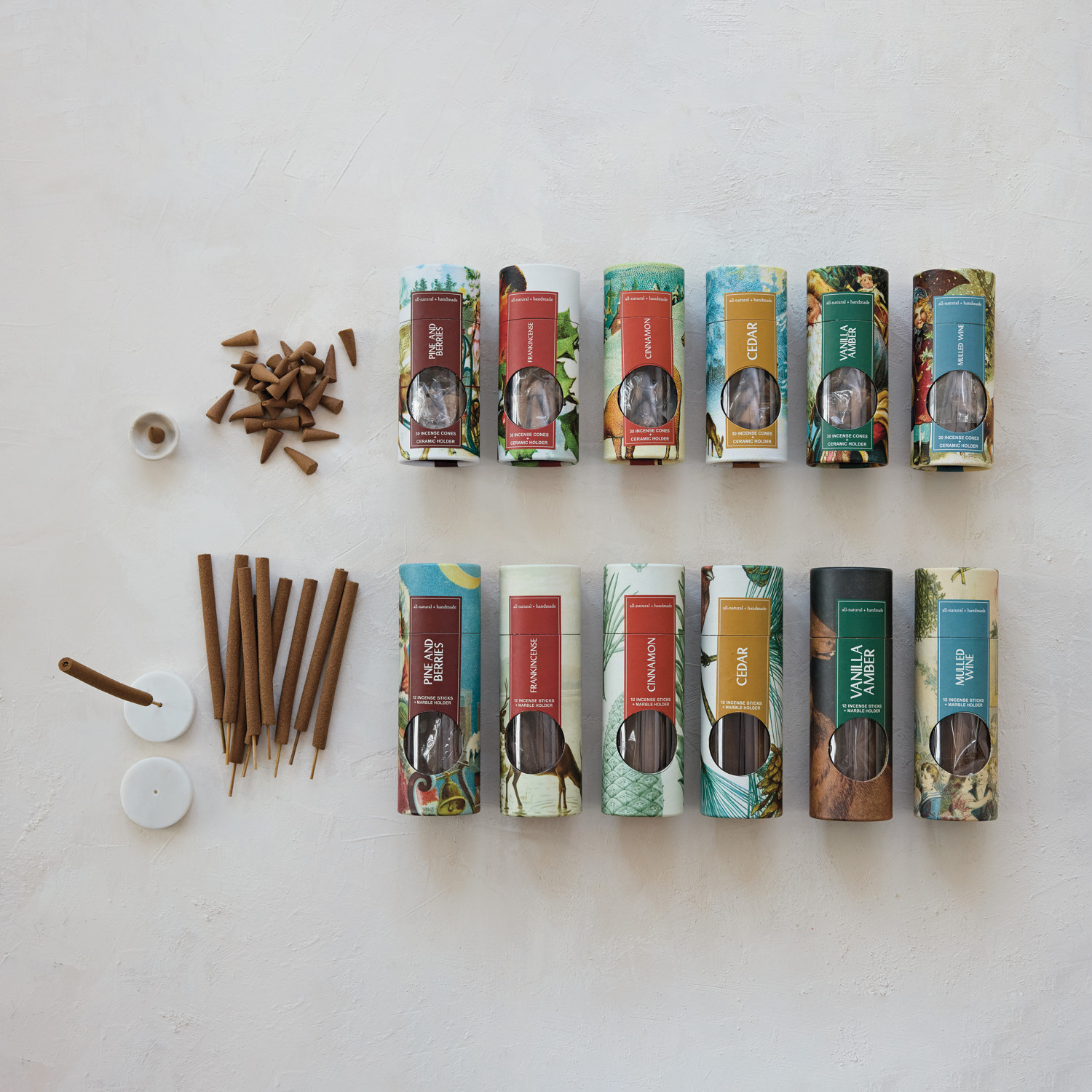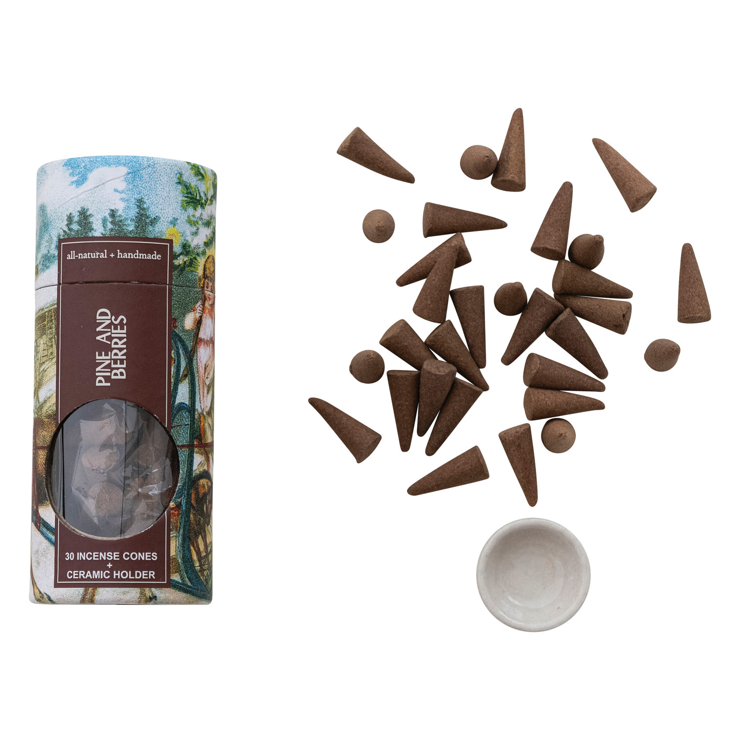 Catalog Name: 1"L 30 Piece All Natural Handmade Pine & Berries Scented Incense Cones in Printed Tube w/ 1-1/2" Round White Ceramic Incense Holder, Set of 31 (Est. Burn Time 20 Minutes)