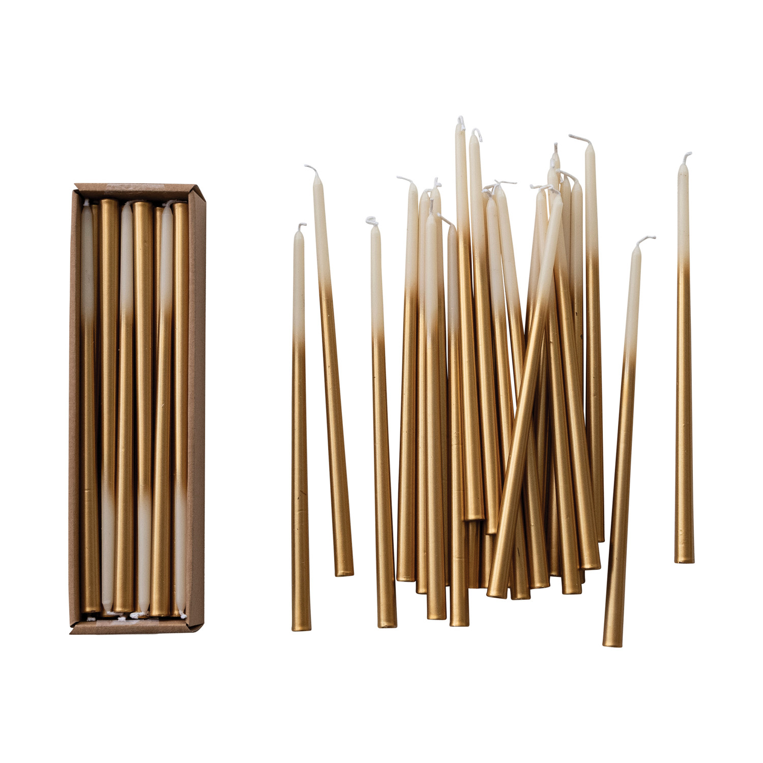 Catalog Name: Approx. 1/2" Round x 10"H Unscented Two-Tone Thin Taper Candles in Box, Cream & Gold Color, Set of 24 (Est. Burn Time 3-1/2 Hours)