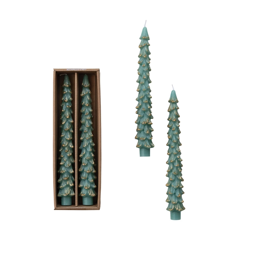 Unscented Tree Shaped Taper Candles with Gold Tips in Box, Mint Color, Set of 2