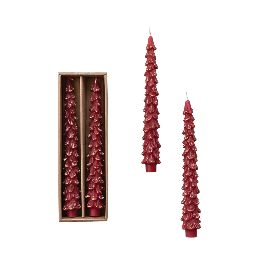 Unscented Tree Shaped Taper Candles with Gold Tips in Box, Burgundy, Set of 2
