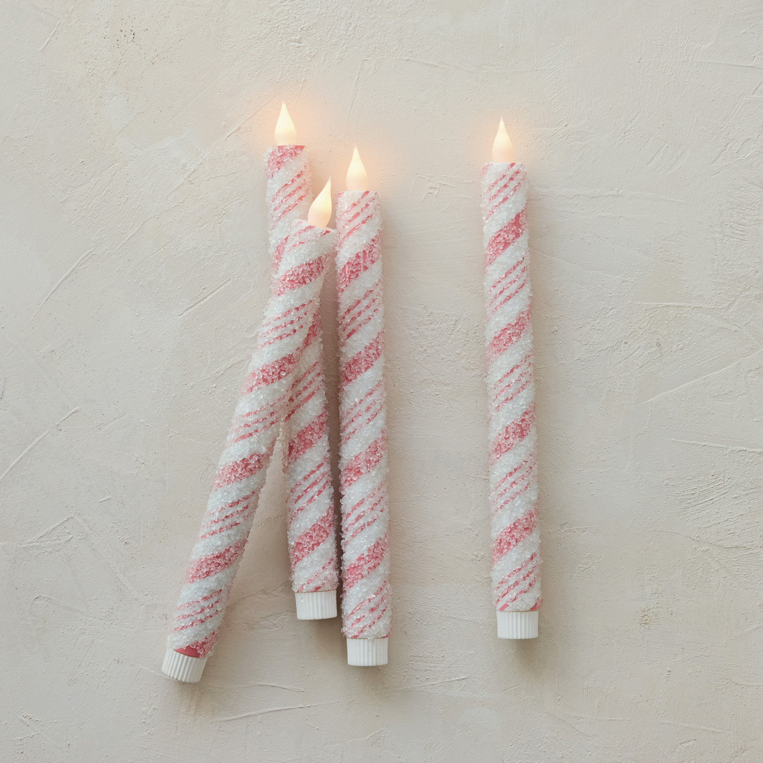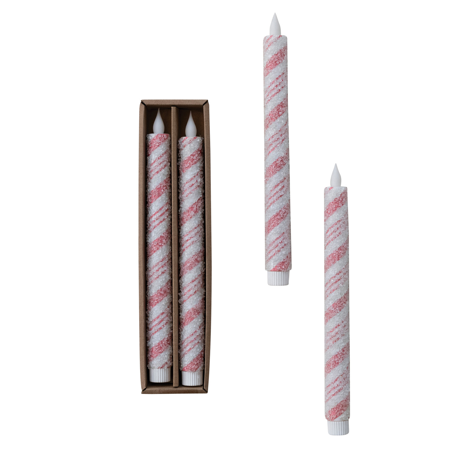 Catalog Name: 3/4" Round x 10-1/2"H Flameless LED Taper Candles w/ Candy Cane Stripes & 6 Hour Timer in Box, Pink & White w/ Sugar, Set of 2 (Requires 2-AA Batteries)