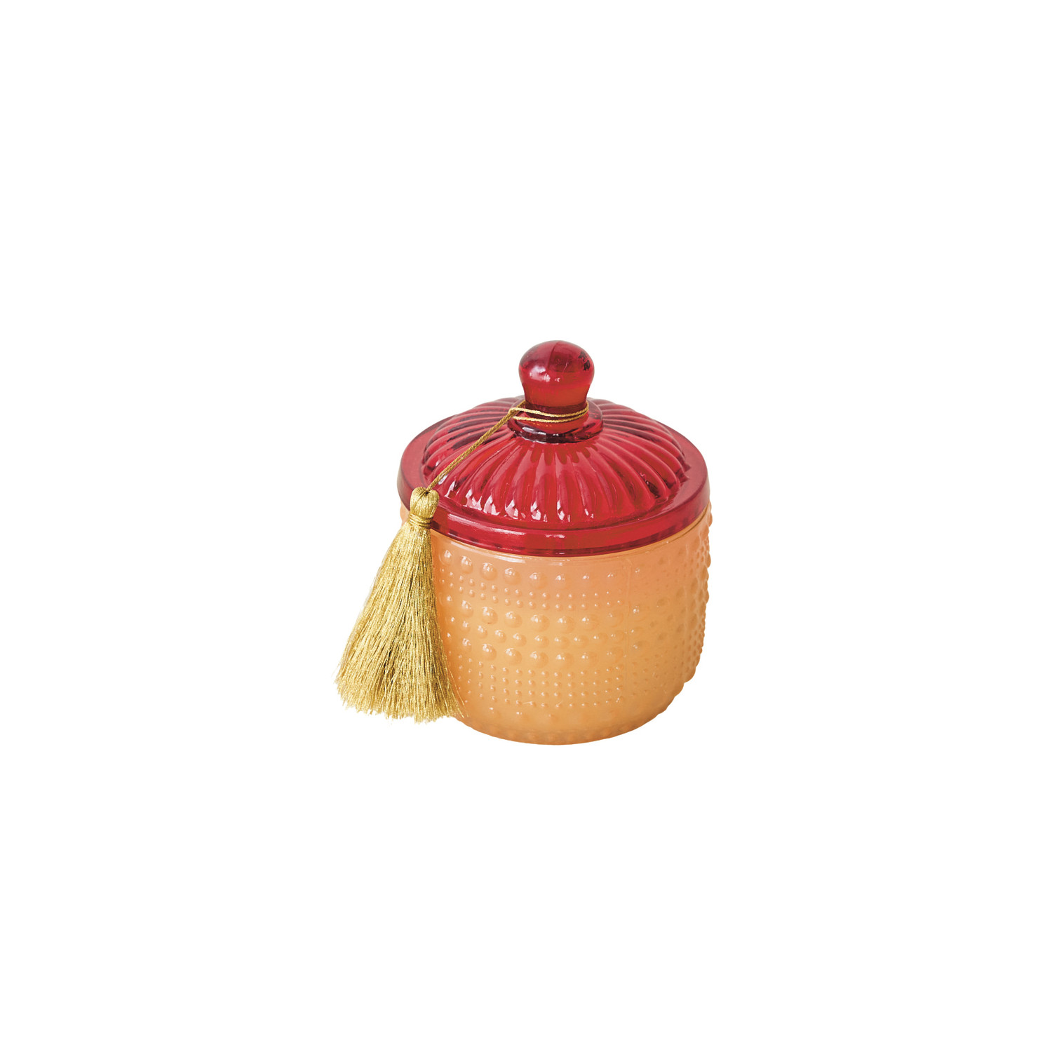 Catalog Name: 4-1/4" Round x 5"H 9.5 oz. Embossed Glass Laurel & Spice Scented Jar Candle w/ Lid & Gold Color Tassel, Red & Apricot Color